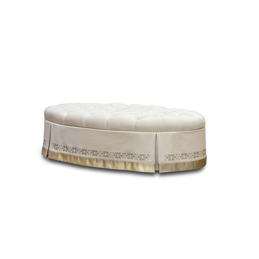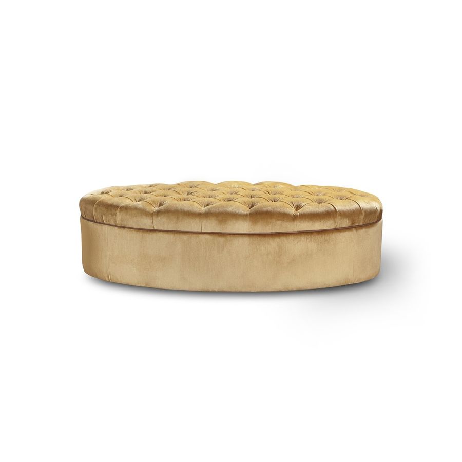 The Olympia footstool has an elegant oval shape and deep buttoning that brings interest to any room. Also available without buttoning.