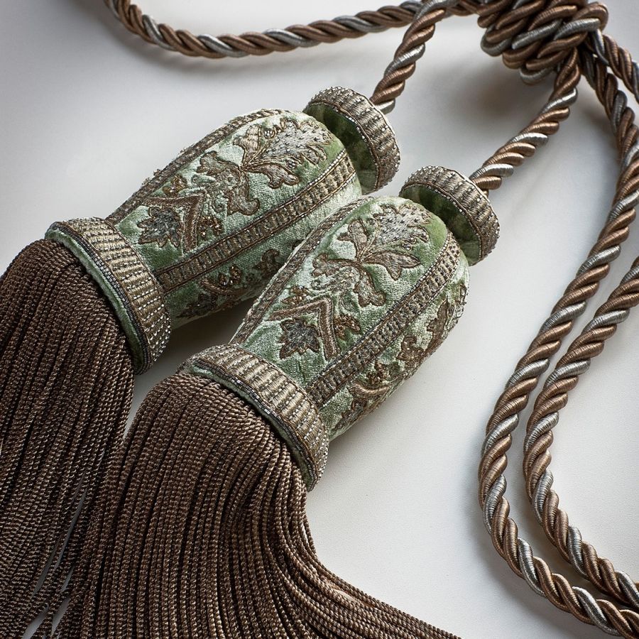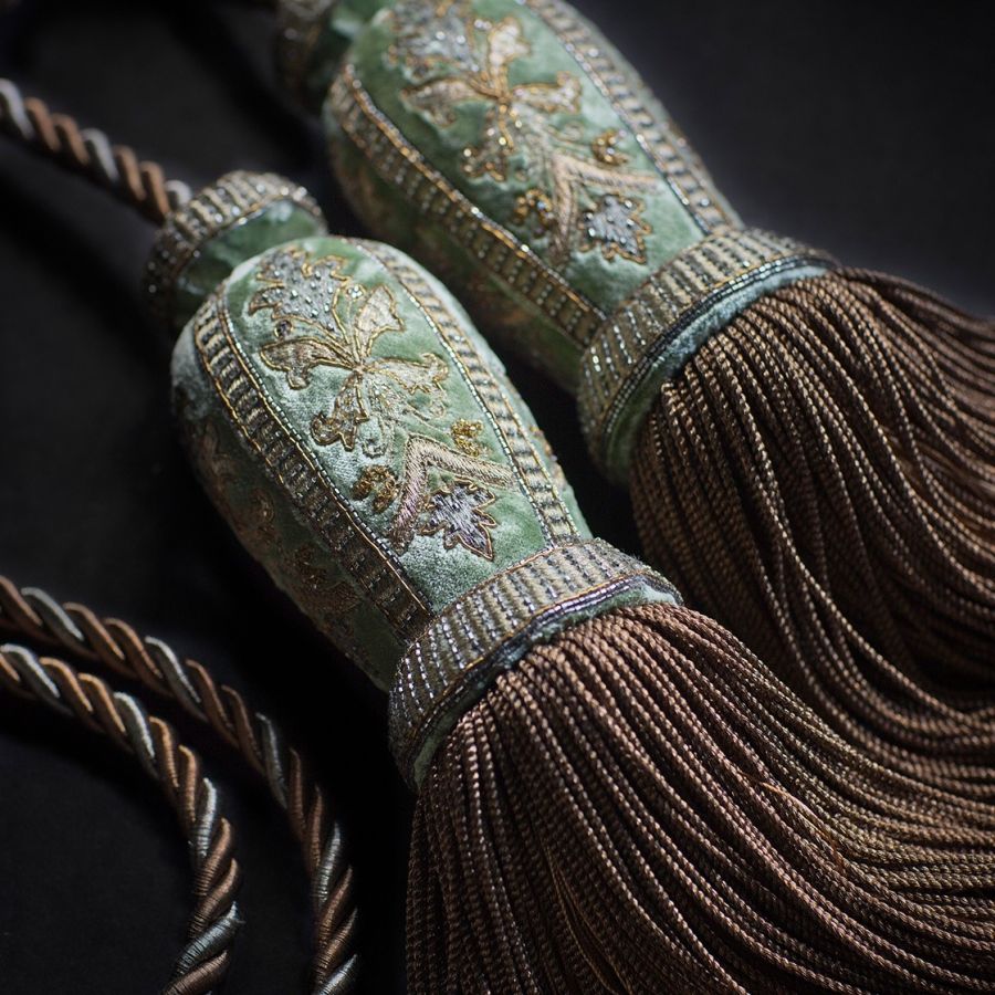 Our Couture tie backs are bespoke and hand crafted to order. They can be made in fine gold, silver bronze, pewter or silk threads and embellished with freshwater pearls and semi-precious stones.| Mått (HxBxD): | cm: 47 / inch: 18" |