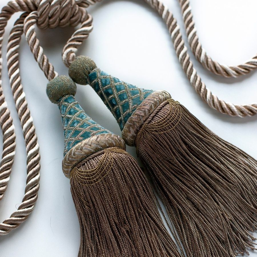 The Desdemona tie back has an elegant tapering conical body, finely worked with a trellis pattern in gold thread and old gold swags over rich gold fringing.