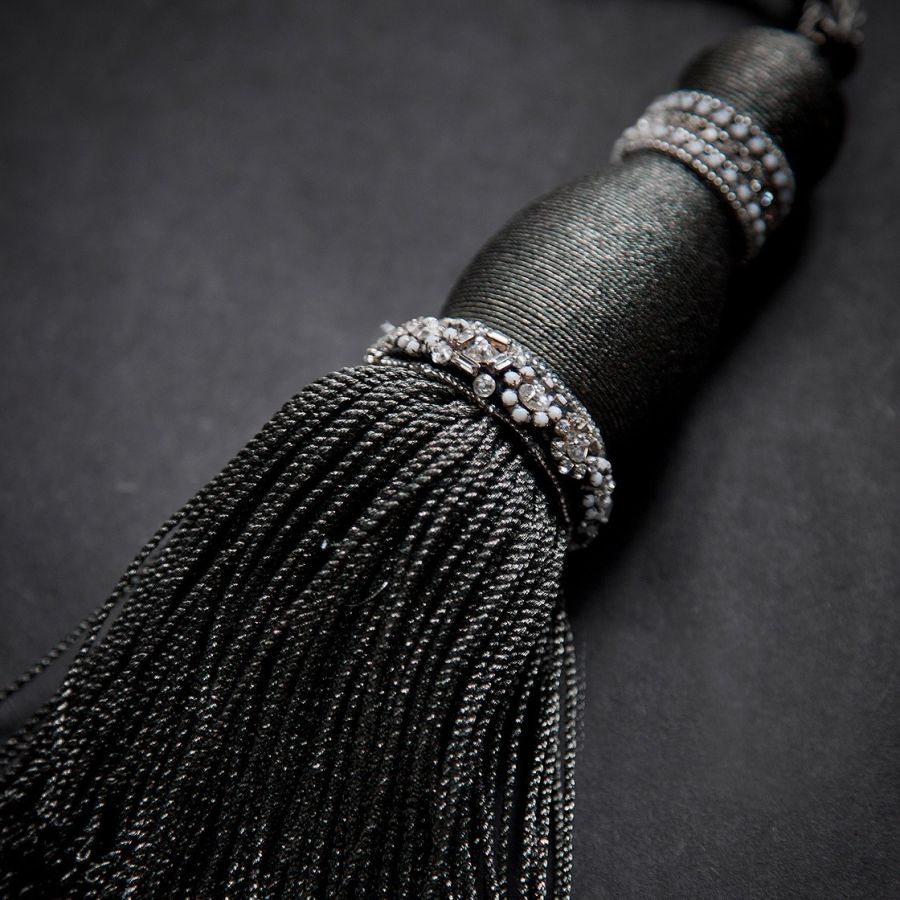 The Ophelia key tassel is understated and stylish, comprising an elegant plain body offset by a delicately jewelled band to the neck and base.