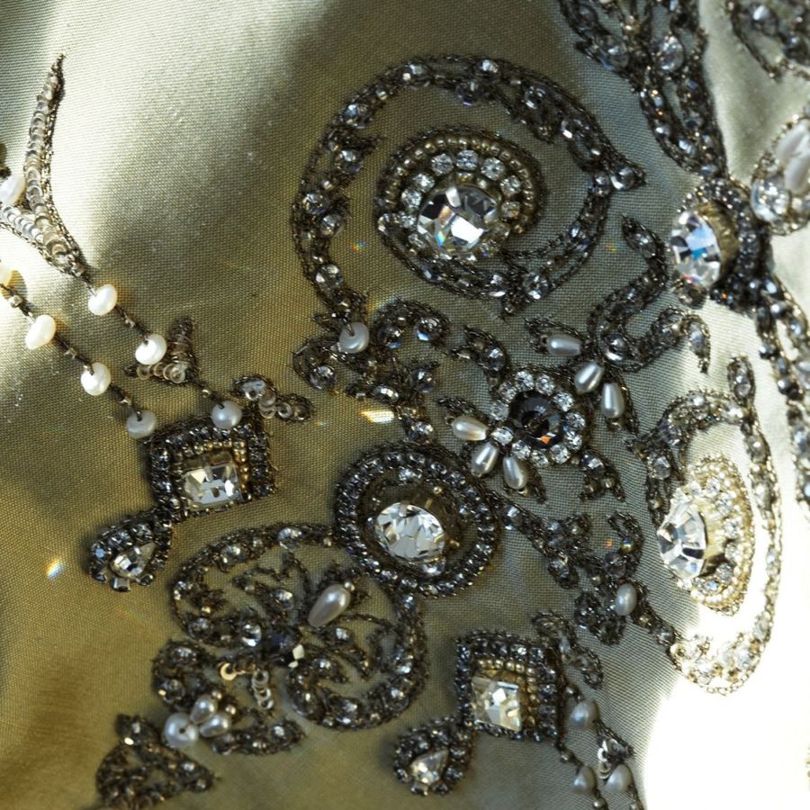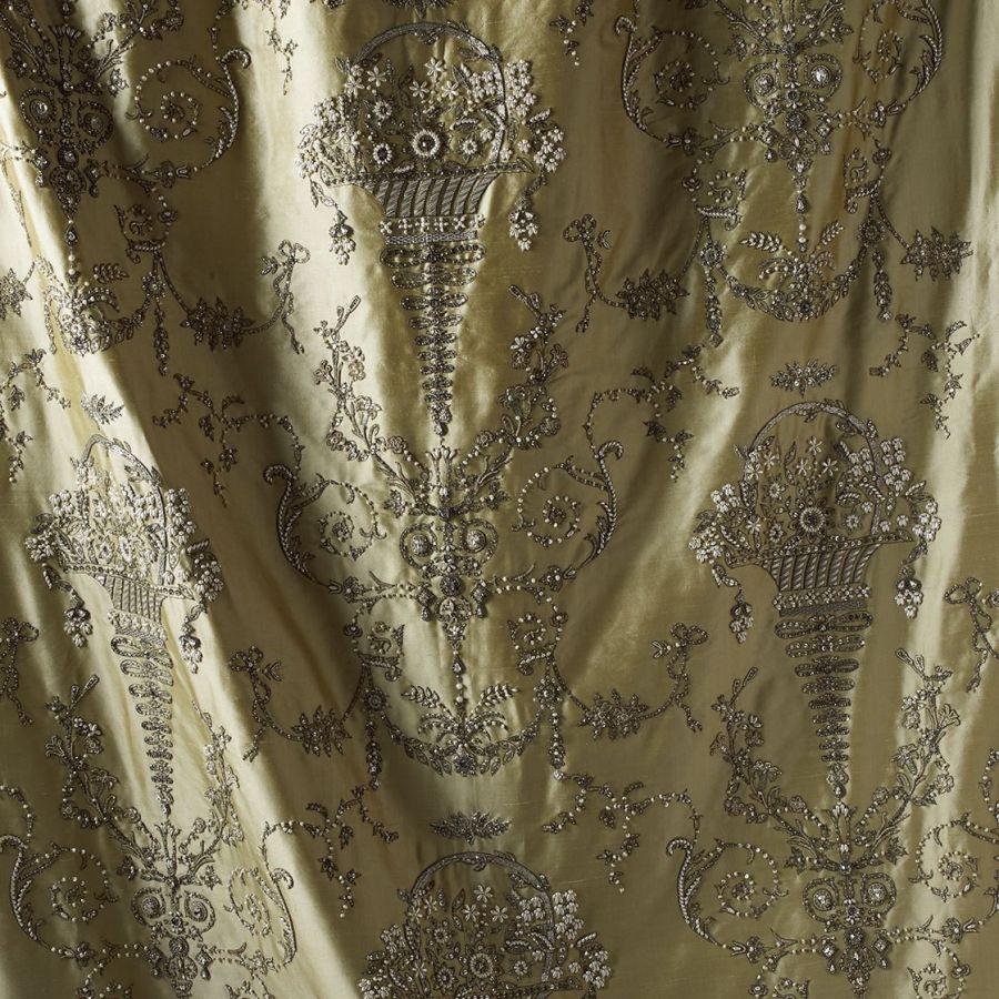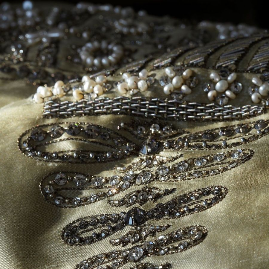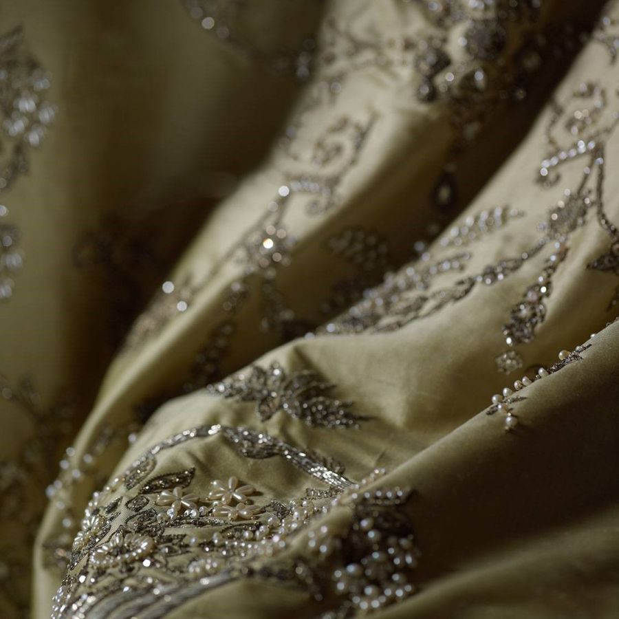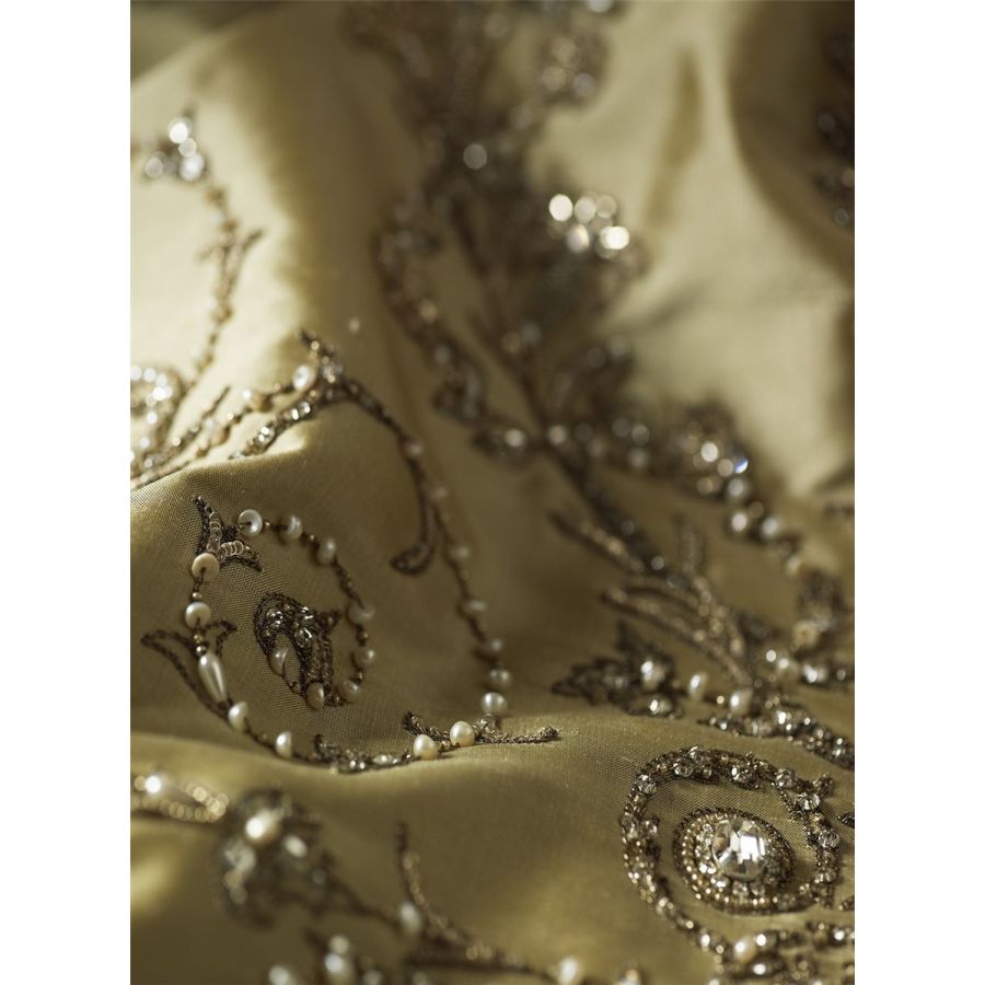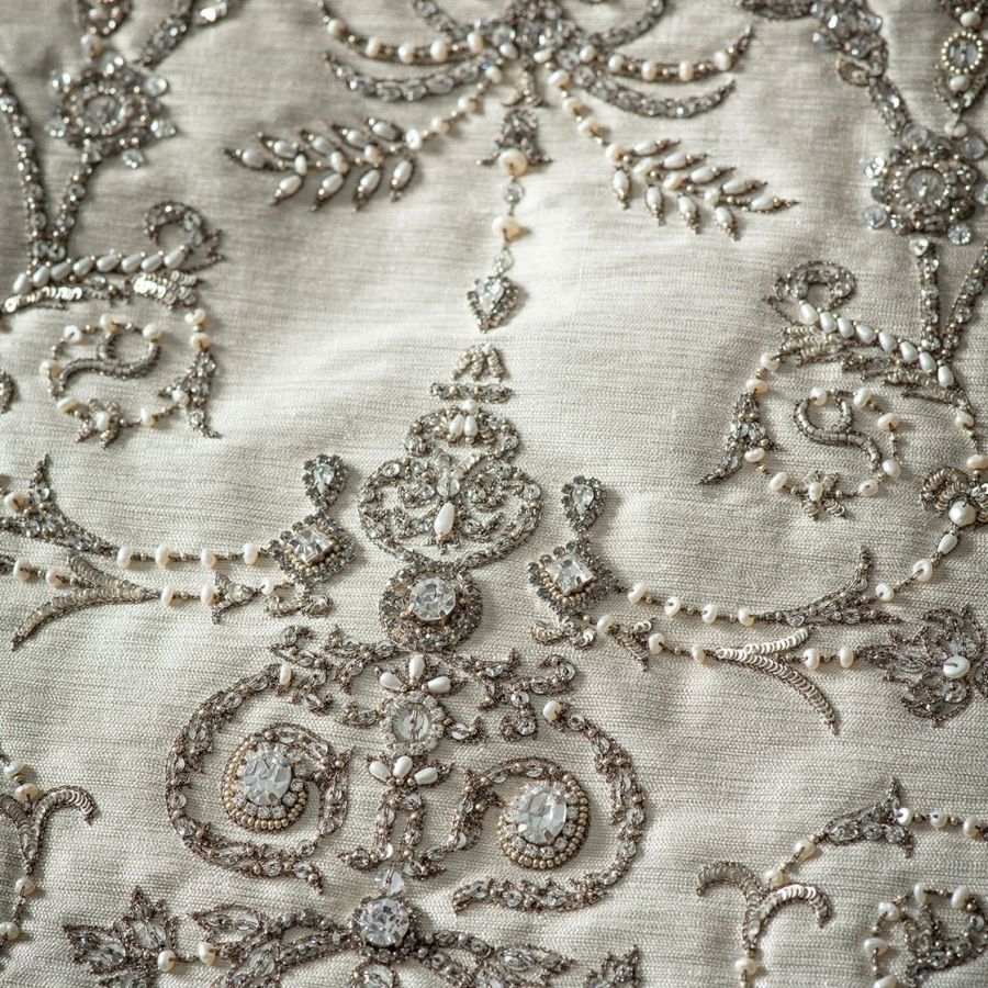 Our Couture fabrics are bespoke and hand embroidered to order. They can be created in fine gold or silver silk thread and embellished with freshwater pearls and semi-precious stones. Each pattern can be coloured and designed to fit your needs. We can embroider onto any background fabric including: silk, velvet, organza and leather.