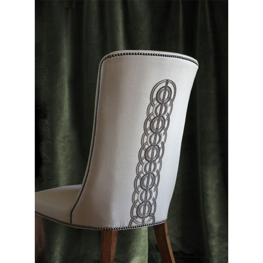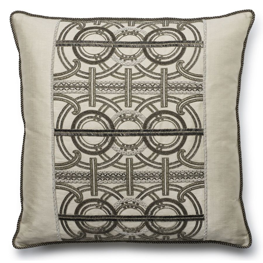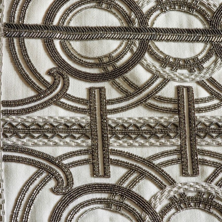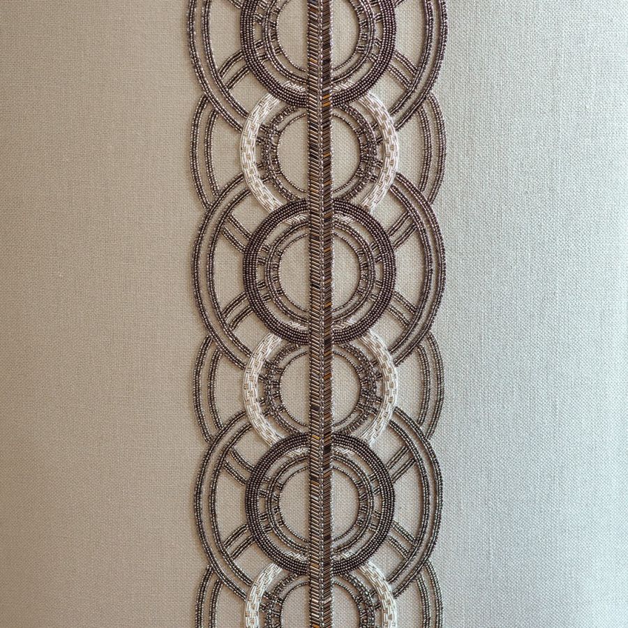 An incredibly luxurious and striking design, Circe’s pattern comprises of concentric circles and strong regimented lines for an Art Deco feel further enhanced by the beautiful hand sewn beadwork.