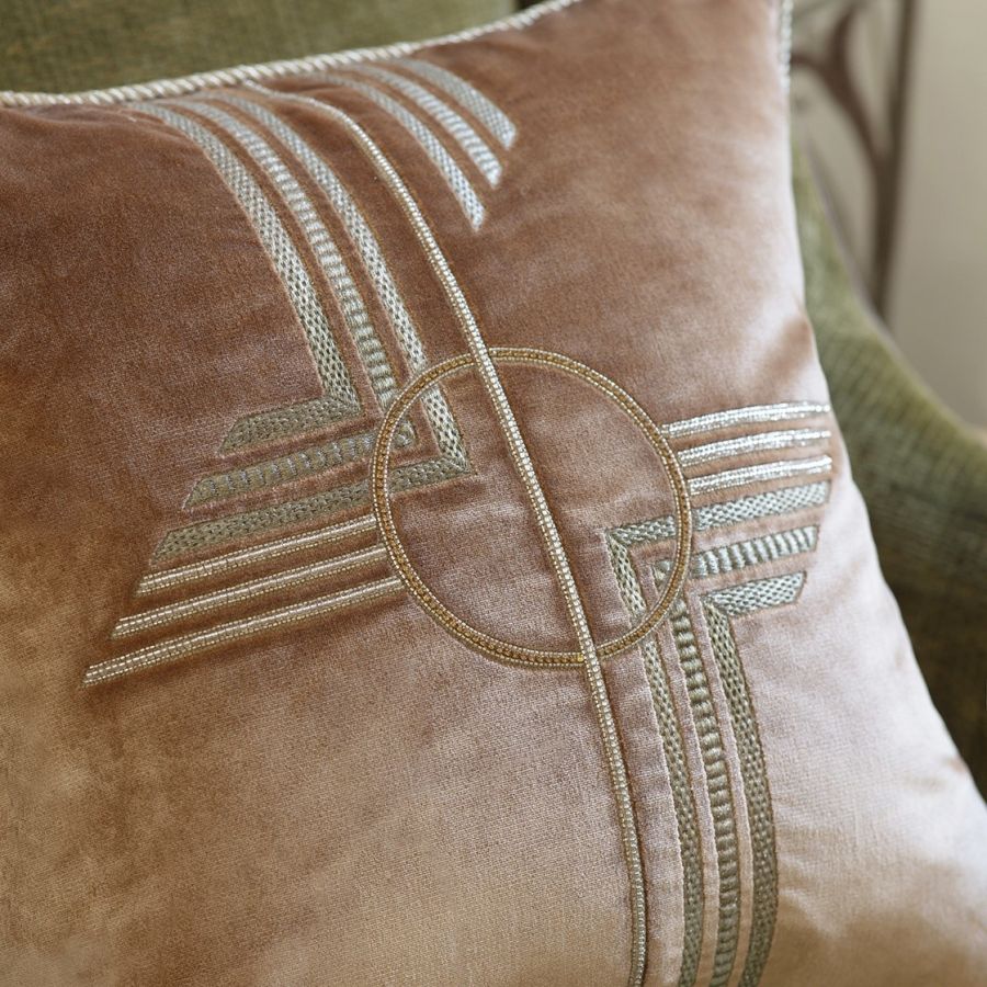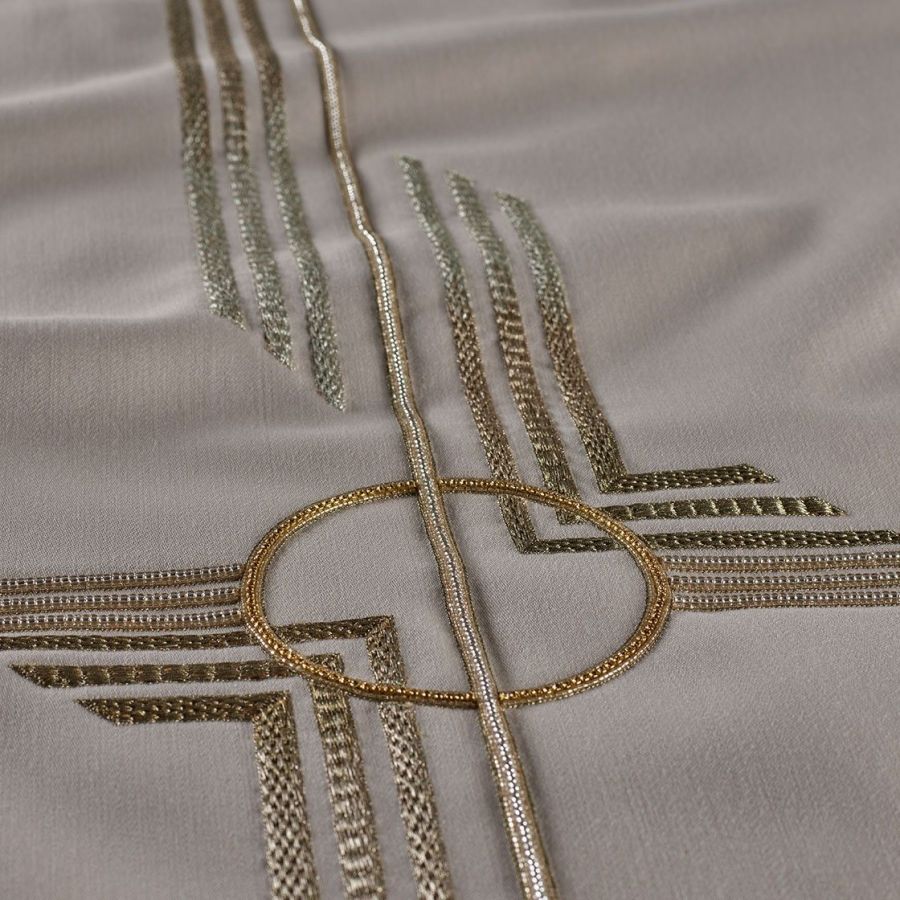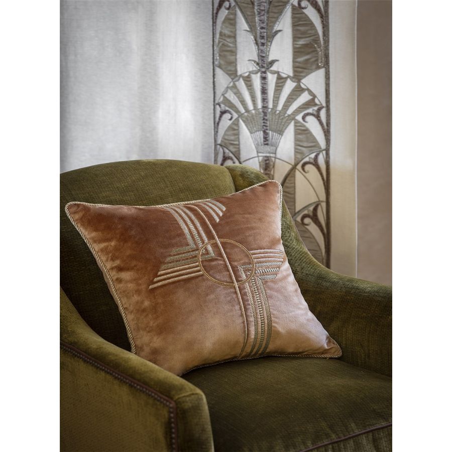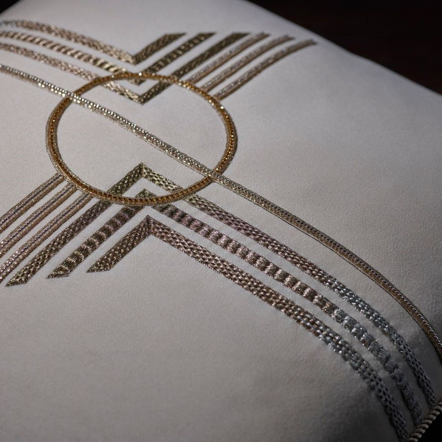 A luxurious, striking Art Deco design, Earhart consists of bold geometric shapes and lines hand embroidered with metallic threads and fine embellishments.