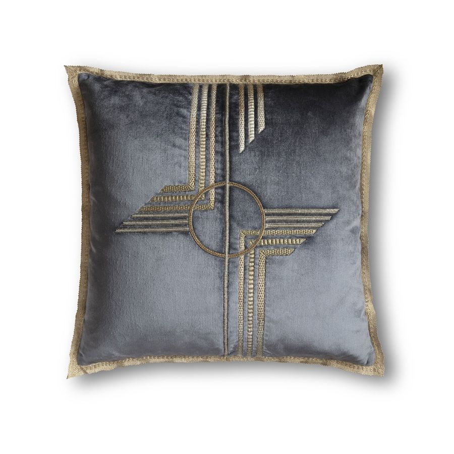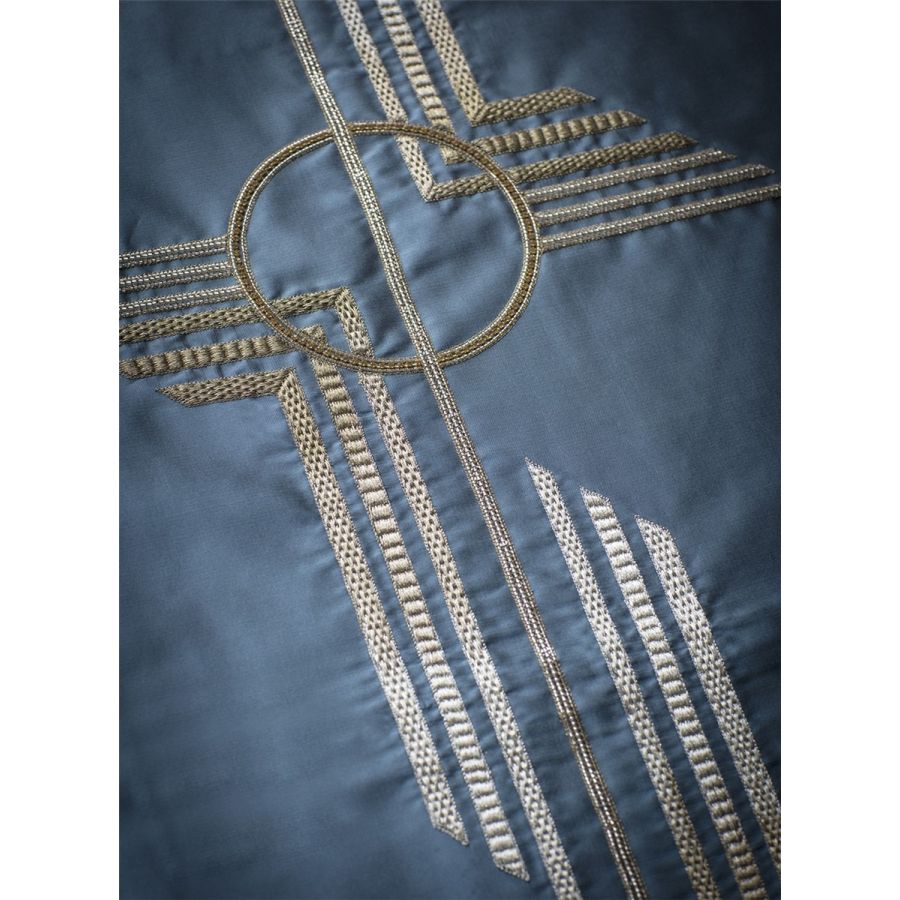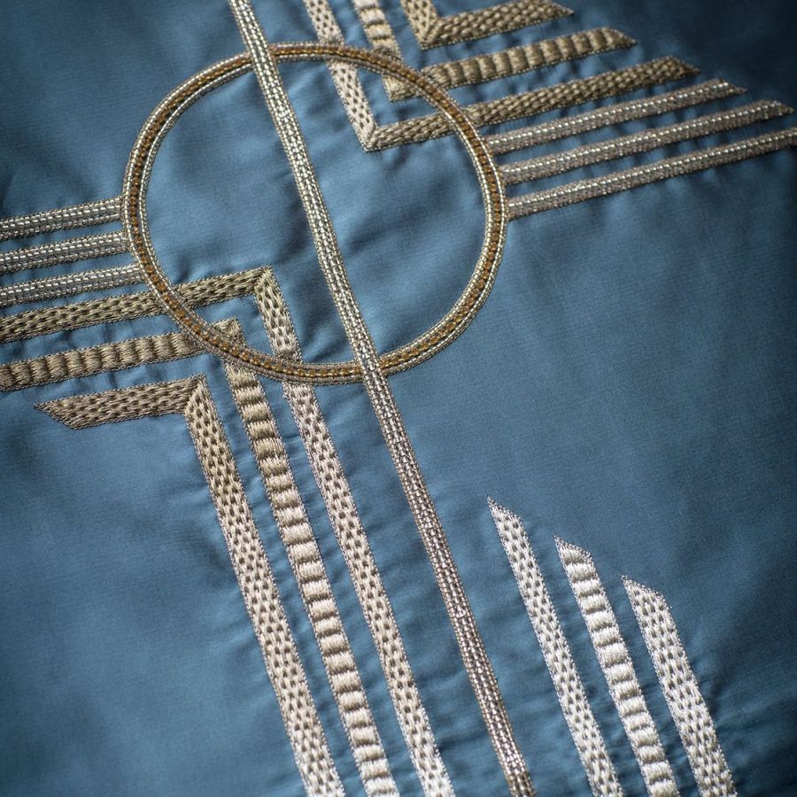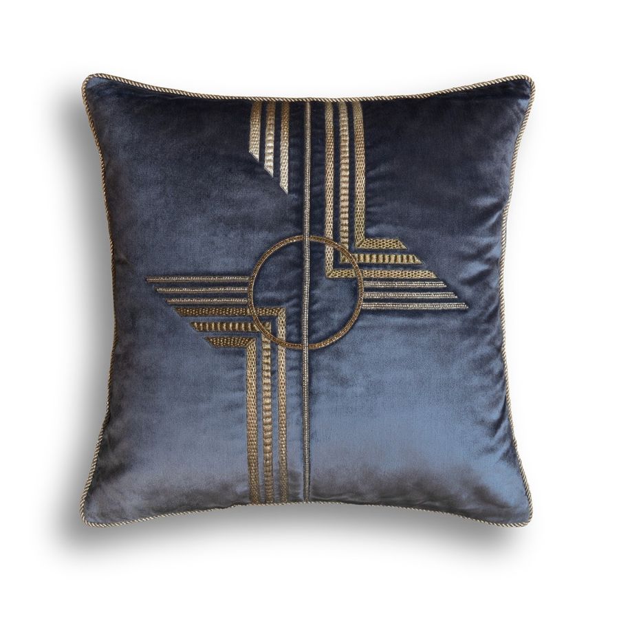 A luxurious, striking Art Deco design, Earhart consists of bold geometric shapes and lines hand embroidered with metallic threads and fine embellishments.