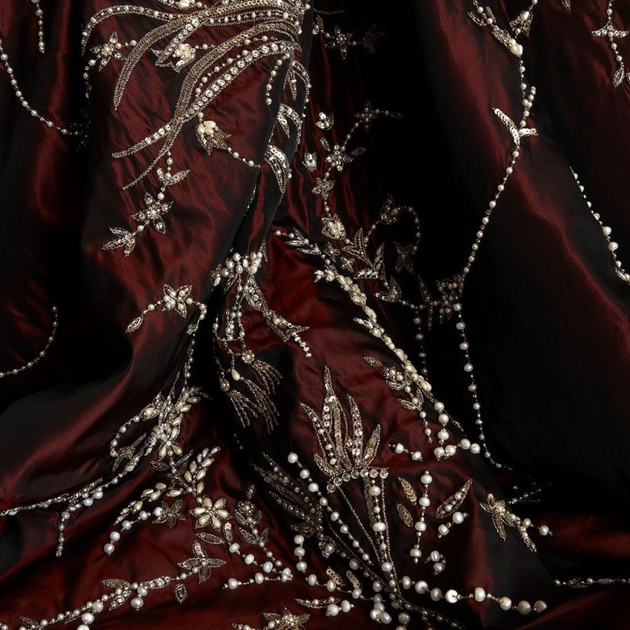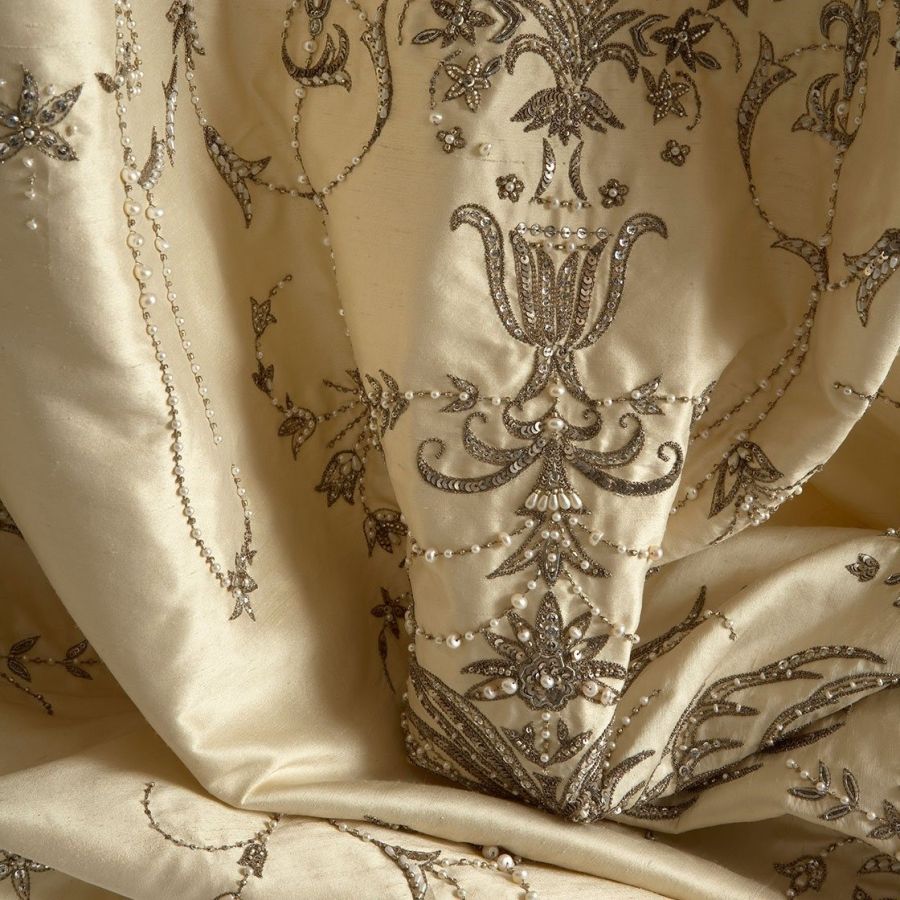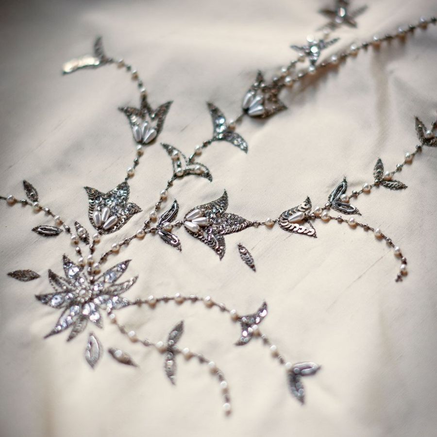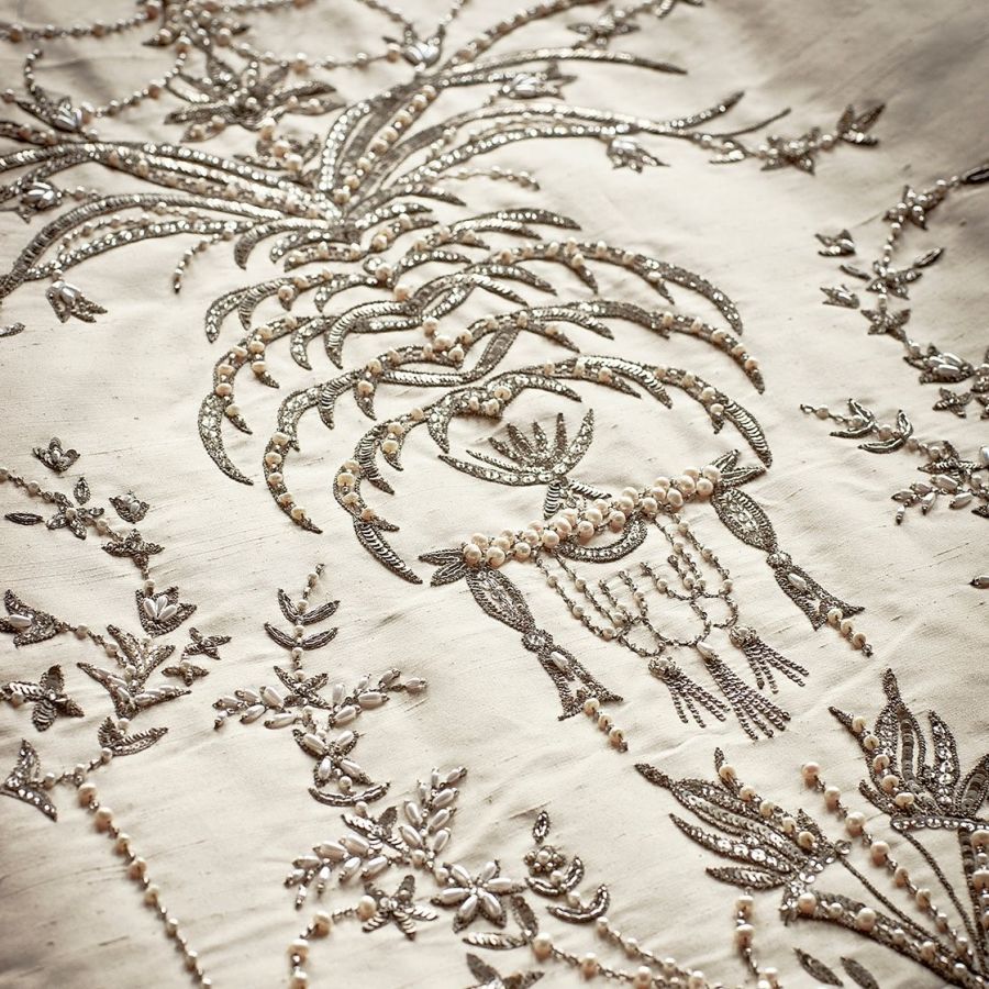 Our Couture fabrics are bespoke and hand embroidered to order. They can be created in fine gold or silver silk thread and embellished with freshwater pearls and semi-precious stones. Each pattern can be coloured and designed to fit your needs. We can embroider onto any background fabric including: silk, velvet, organza and leather.