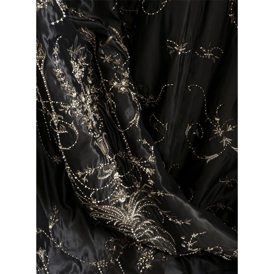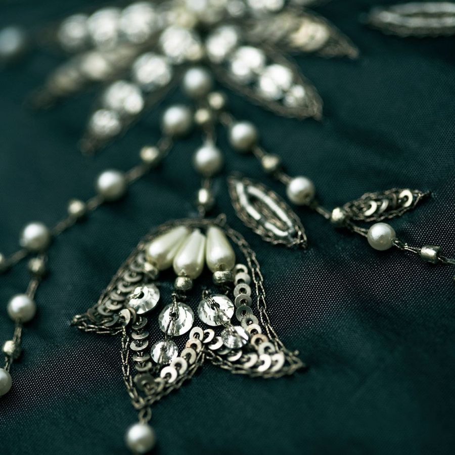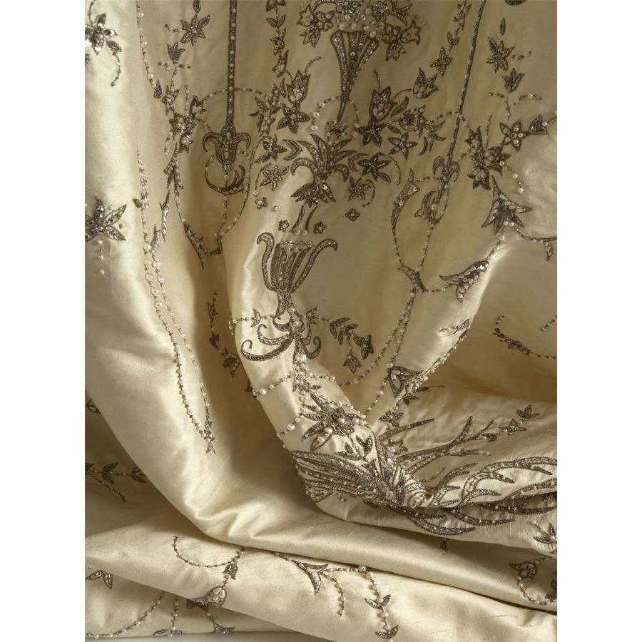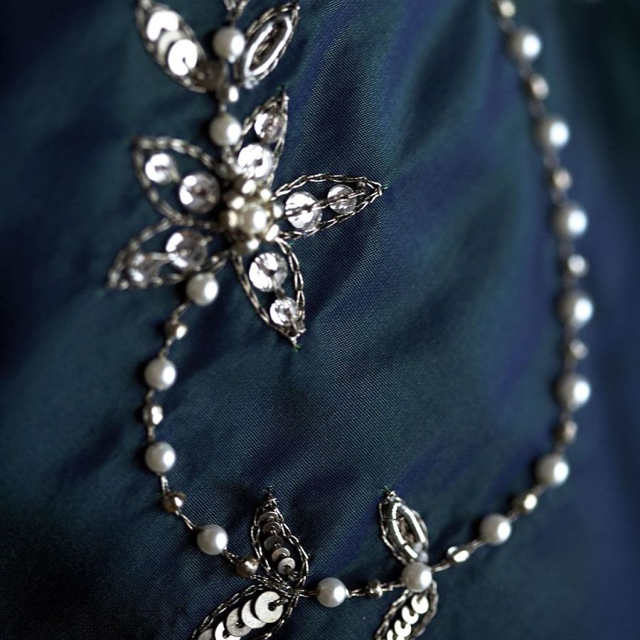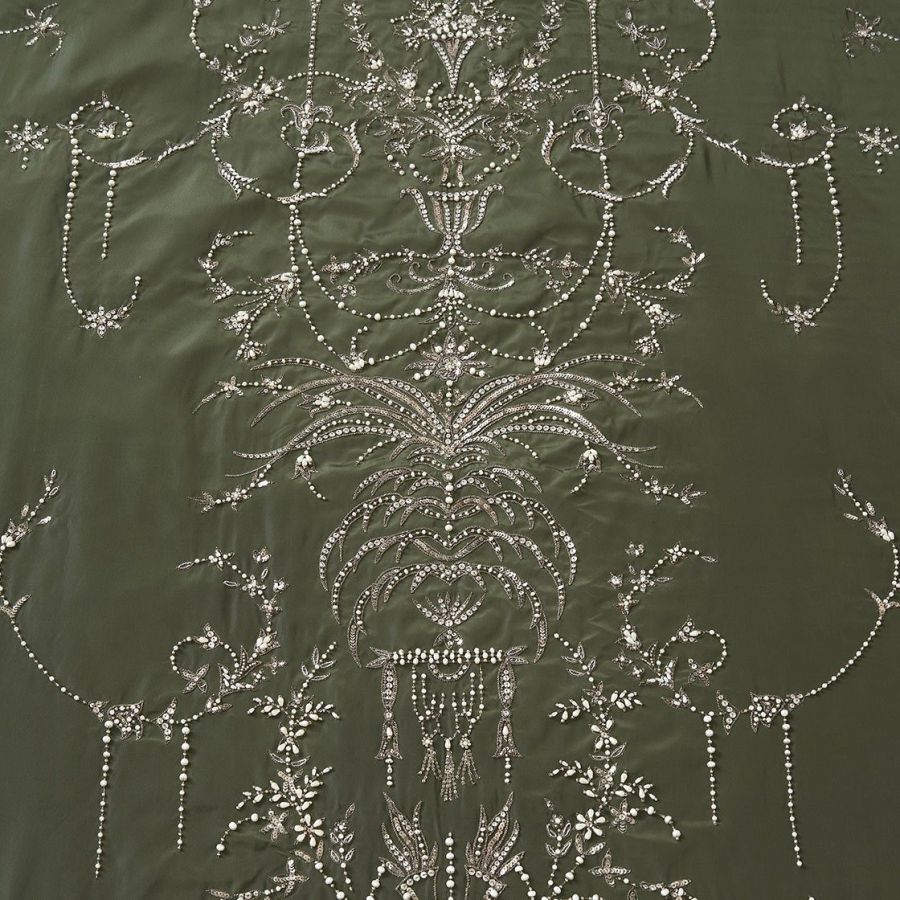 Our Couture fabrics are bespoke and hand embroidered to order. They can be created in fine gold or silver silk thread and embellished with freshwater pearls and semi-precious stones. Each pattern can be coloured and designed to fit your needs. We can embroider onto any background fabric including: silk, velvet, organza and leather.