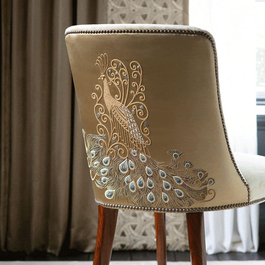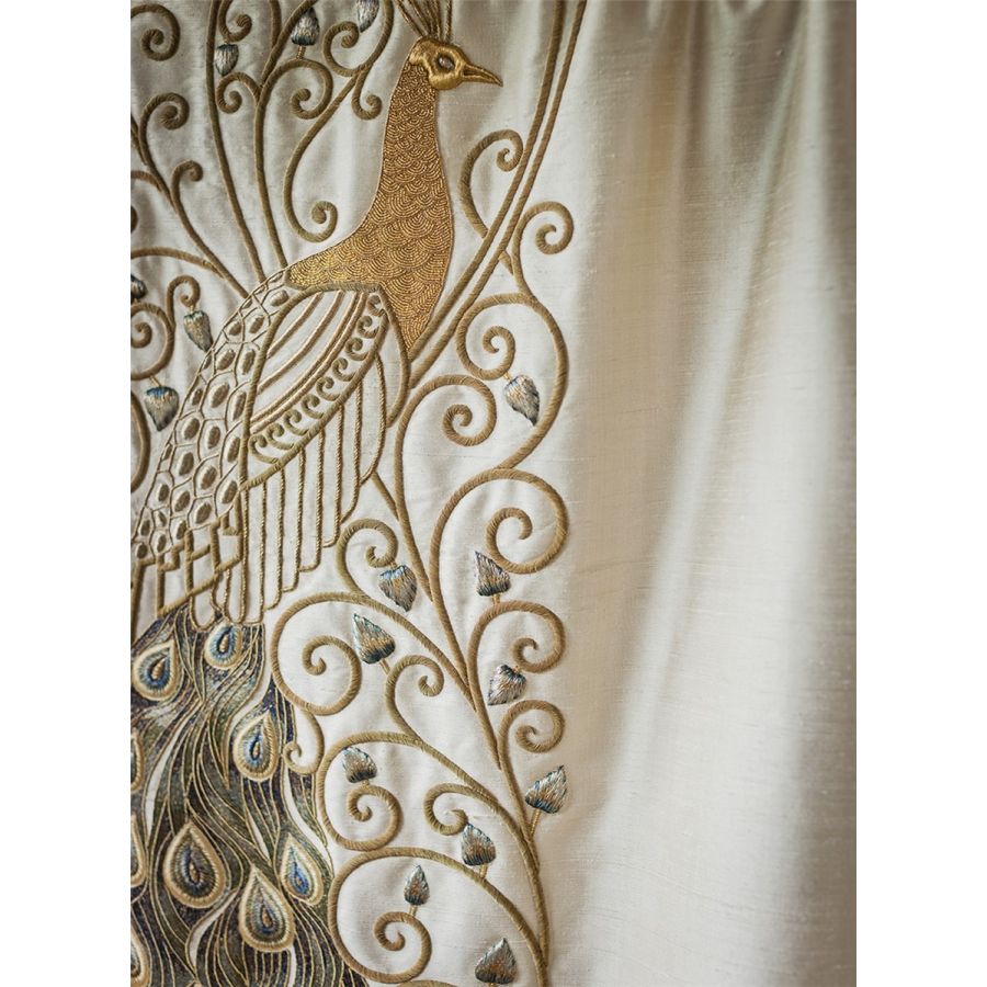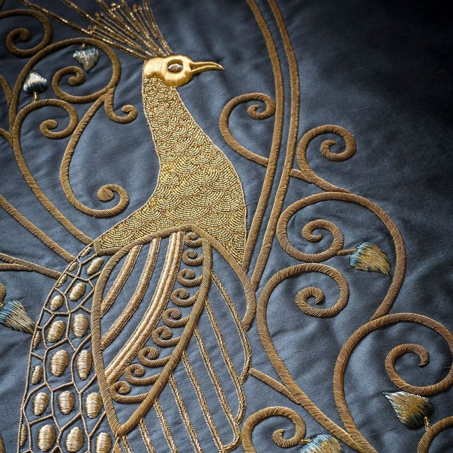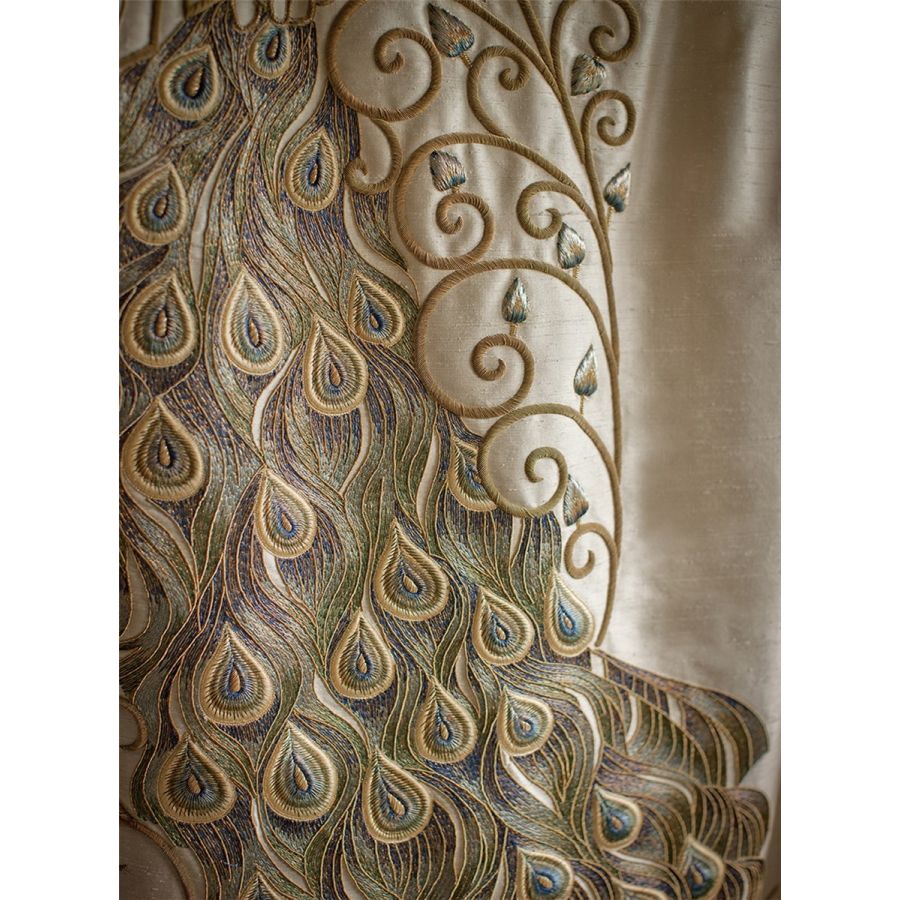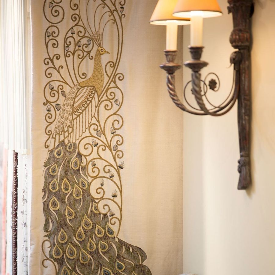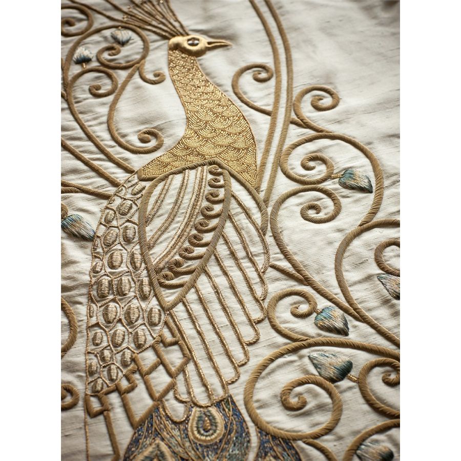Juno is a marvellously dramatic panel combining the exotic plumage of peacocks with a beautifully worked scrolling design in gold thread.