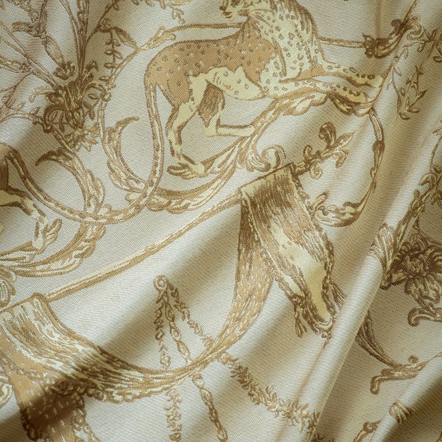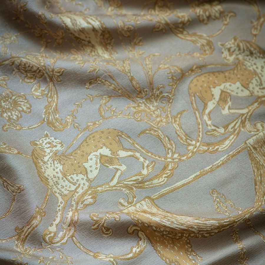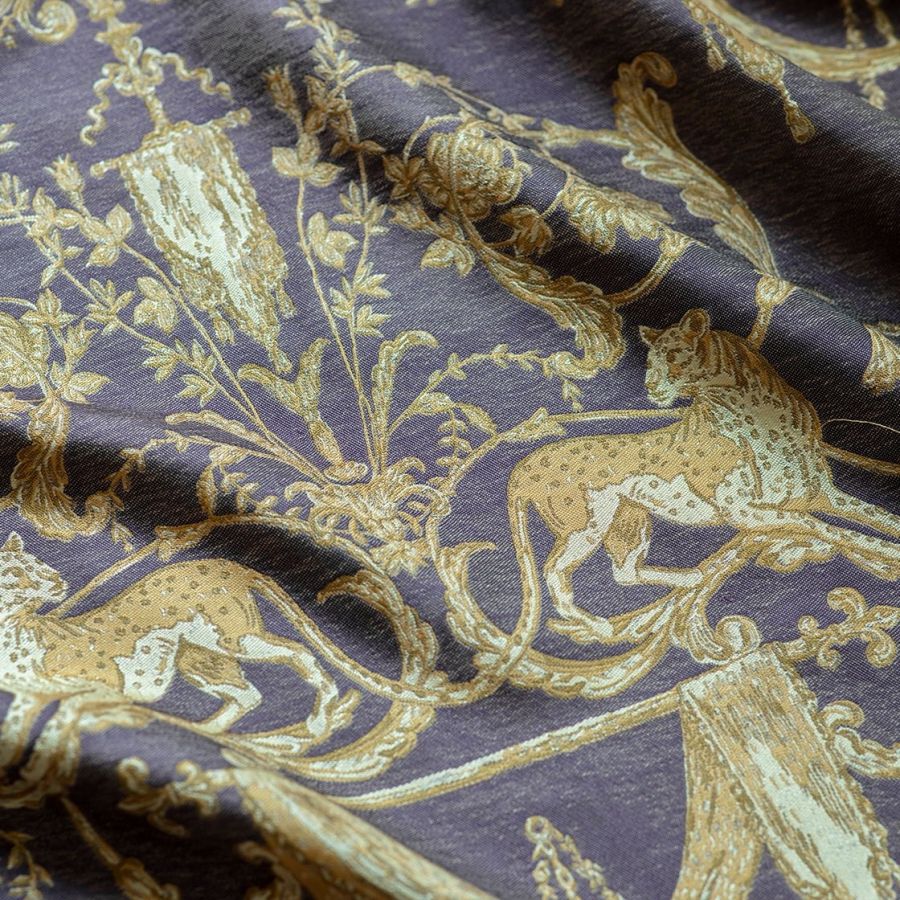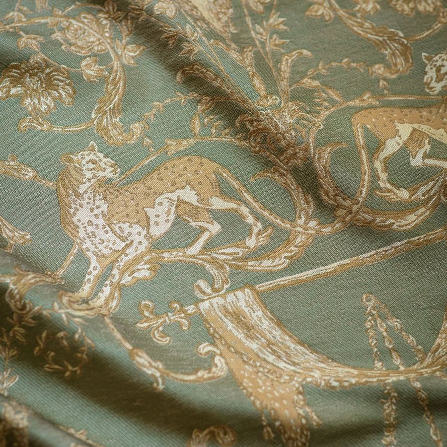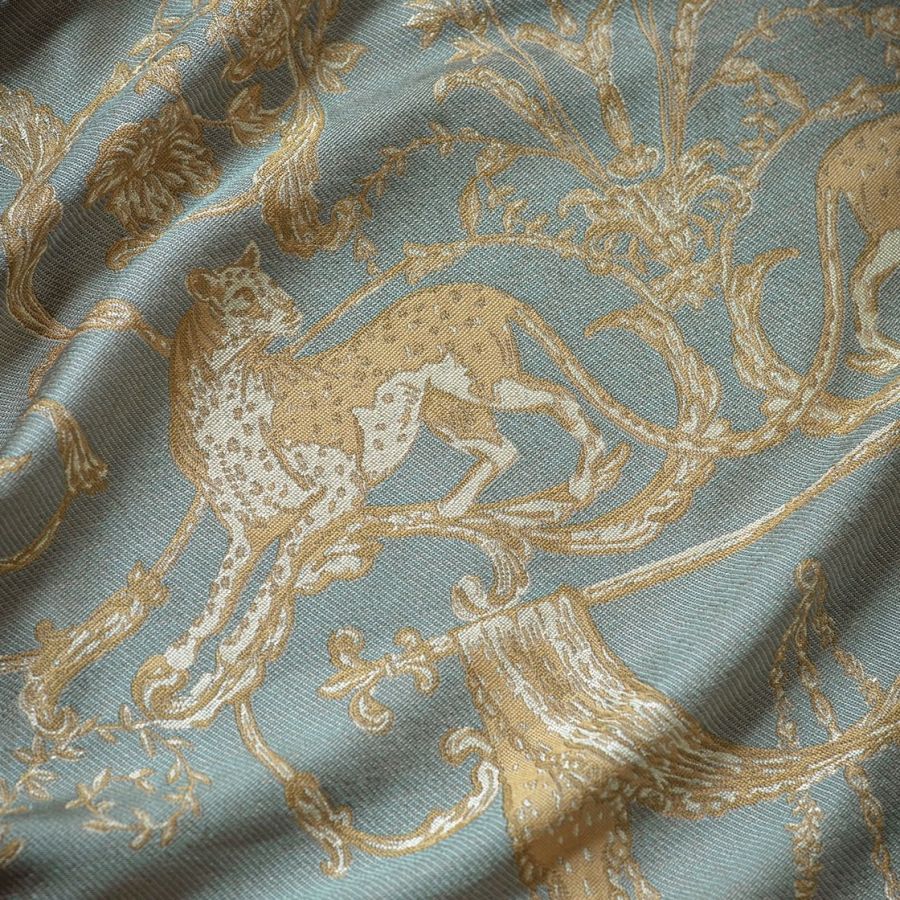 Inspired by Georgian designs, our Lawrence fabric is an inspirational weave depicting cheetahs prowling elegantly through twirling lanterns, scrolls and tassels.
