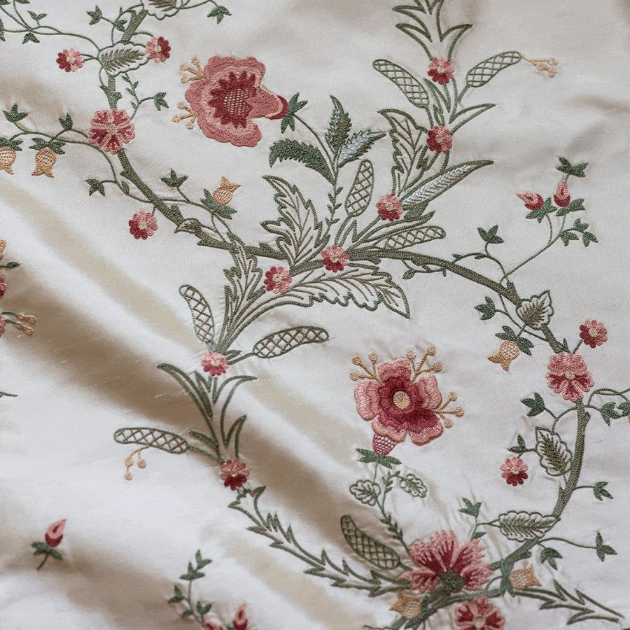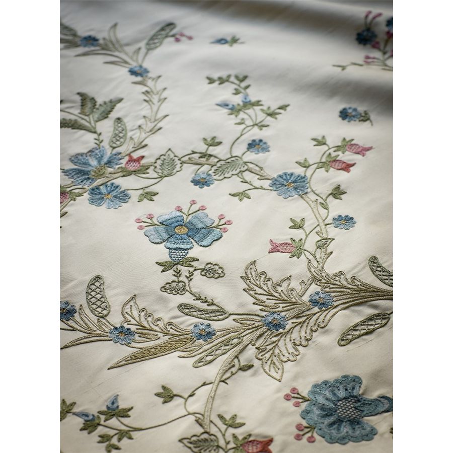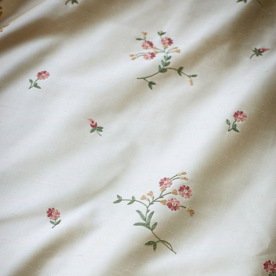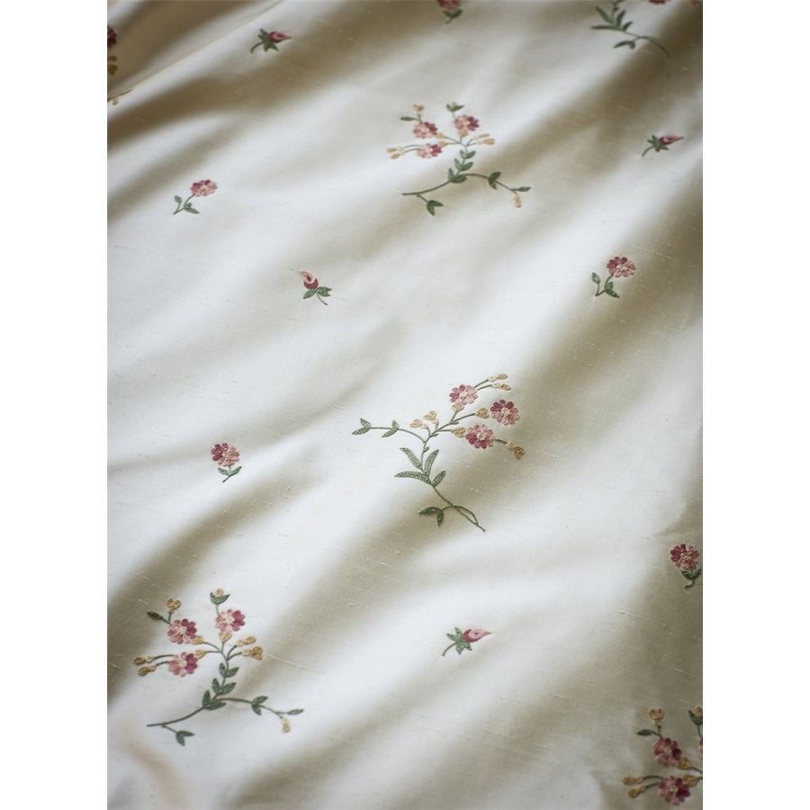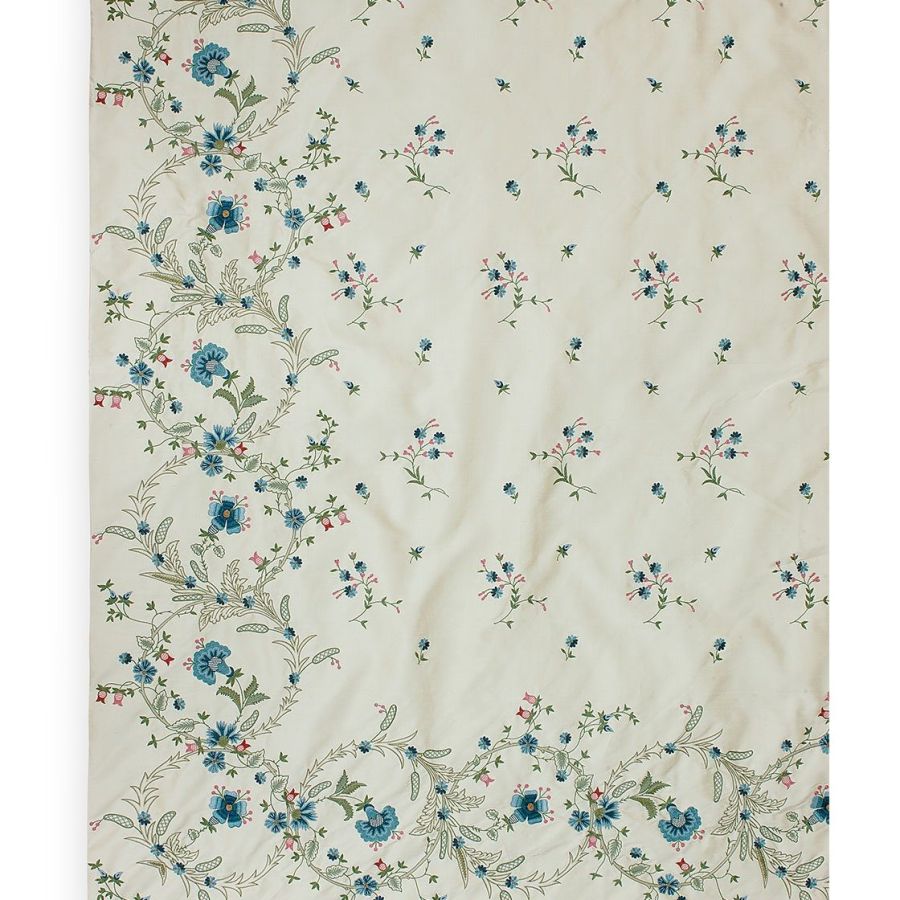 Octavia is a pretty pattern reminiscent of an English countryside. Cornflowers and Rosehips grow from circular structures around the leading edge of this design, while the inner pattern contains scattered flower heads and buds. This design was based on an English Rococo dress silk from the 18th century.