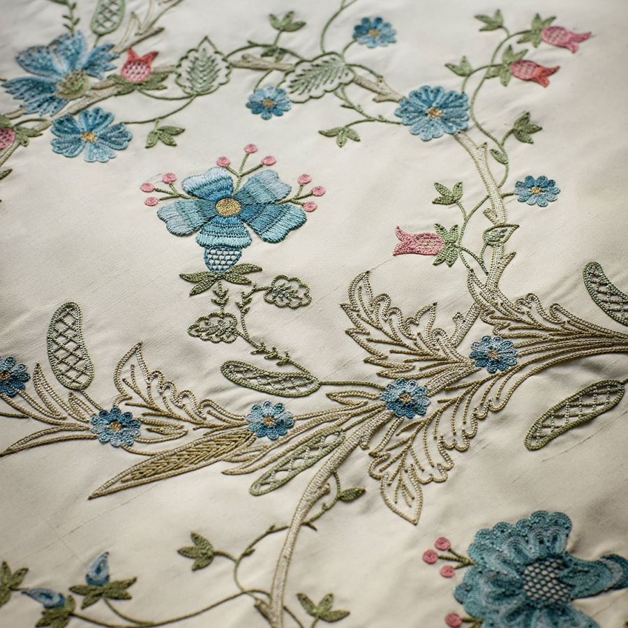 Our Couture fabrics are bespoke and hand embroidered to order. They can be created in fine gold or silver silk thread and embellished with freshwater pearls and semi-precious stones. Each pattern can be coloured and designed to fit your needs. We can embroider onto any background fabric including: silk, velvet, organza and leather.