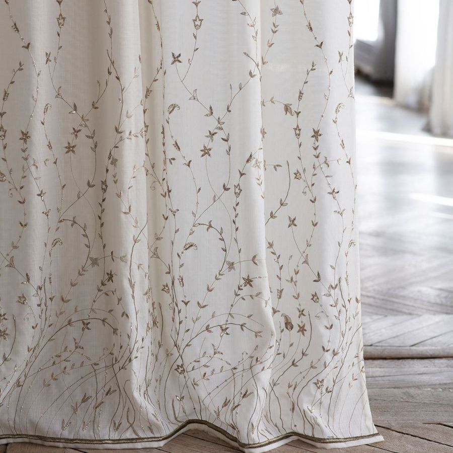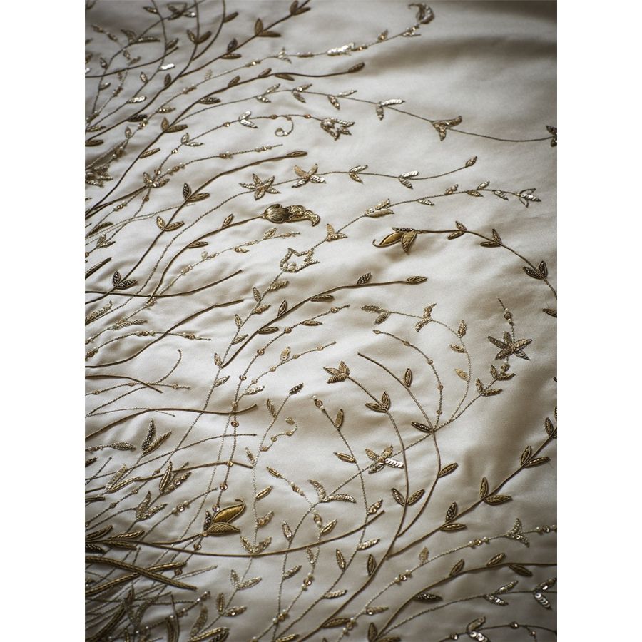 This delicate, ethereal leading edge pattern depicts gently swaying and intertwining grasses. It is hand embroidered with antique gold thread and embellished with tiny pearls and beads.