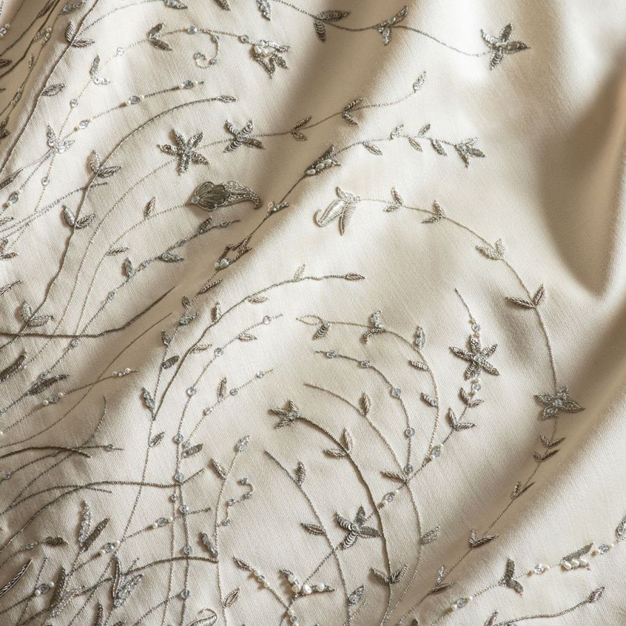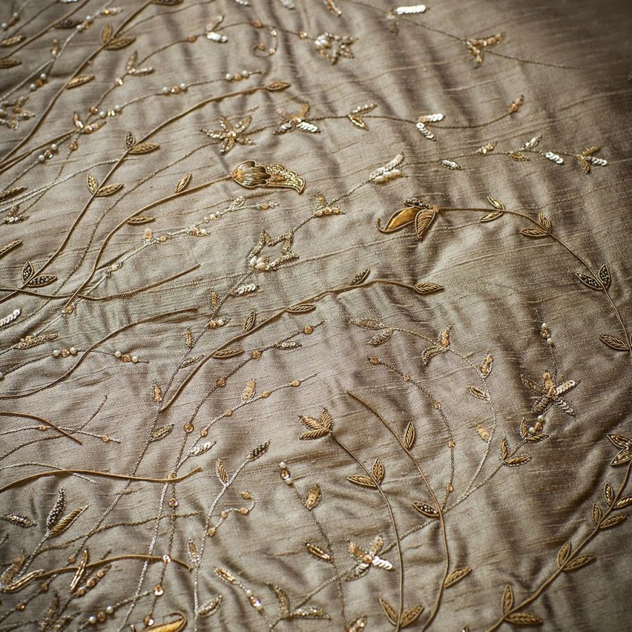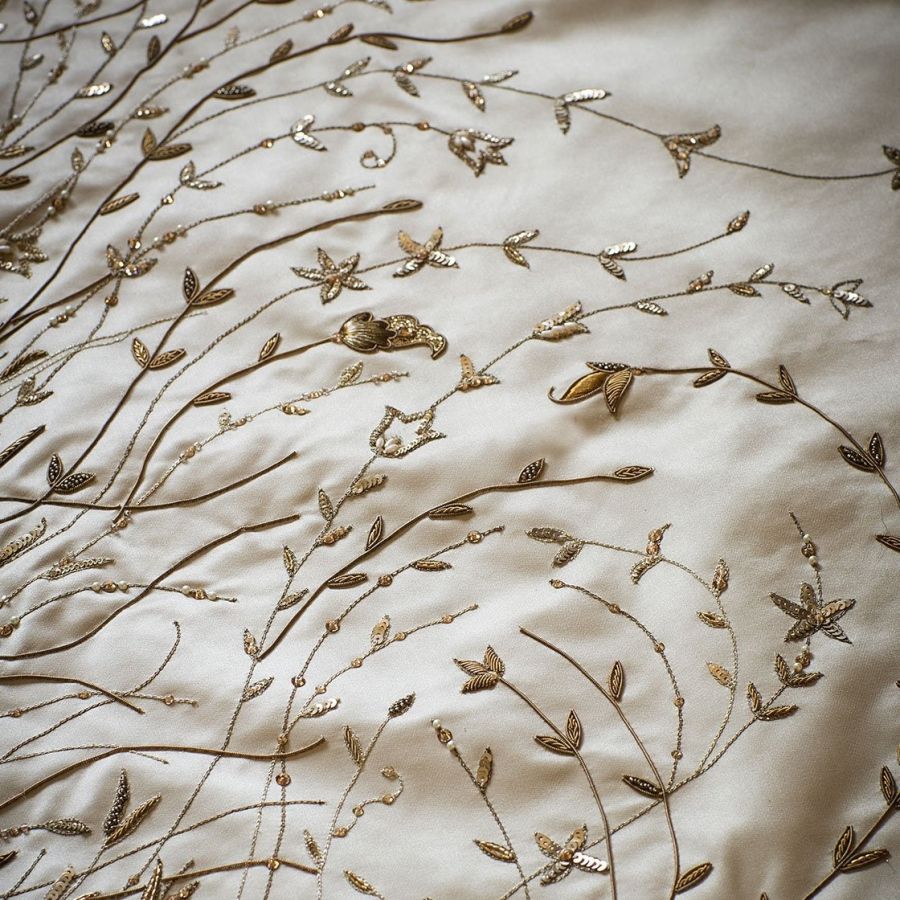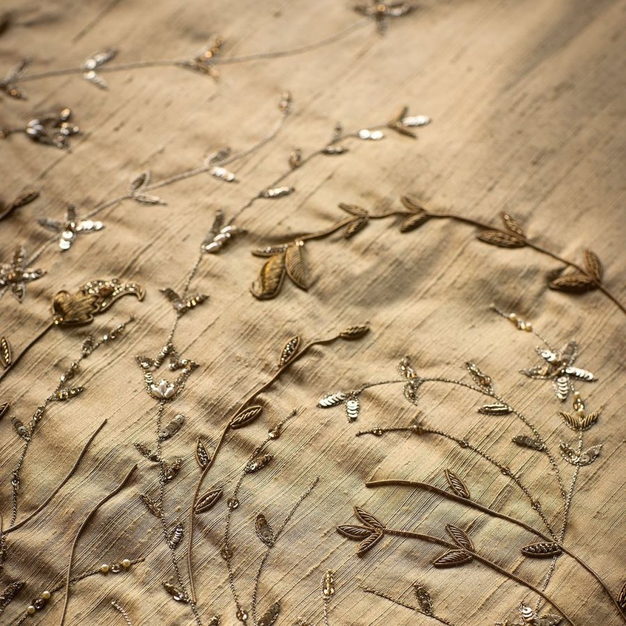 Our Couture fabrics are bespoke and hand embroidered to order. They can be created in fine gold or silver silk thread and embellished with freshwater pearls and semi-precious stones. Each pattern can be coloured and designed to fit your needs. We can embroider onto any background fabric including: silk, velvet, organza and leather.