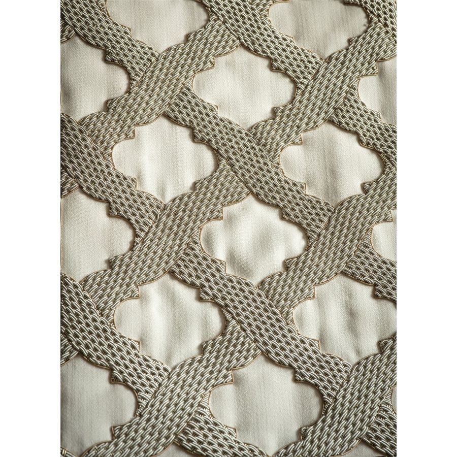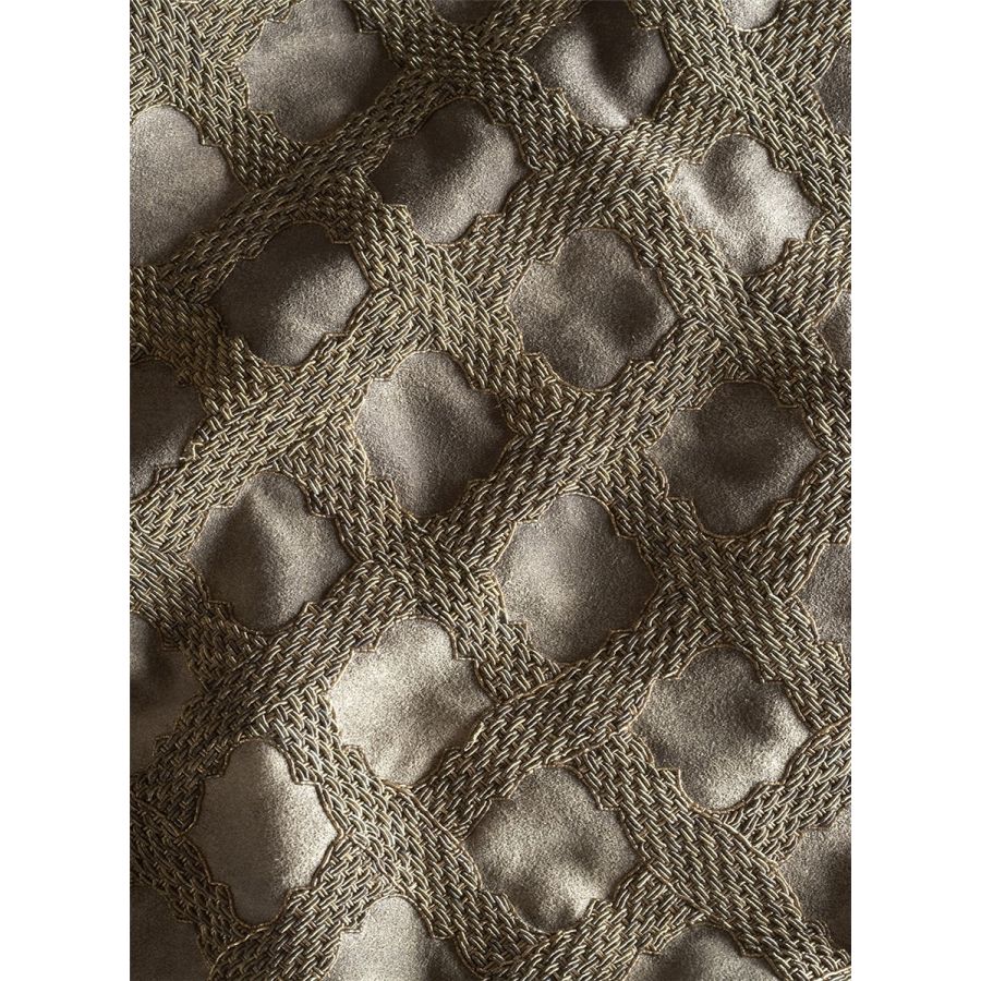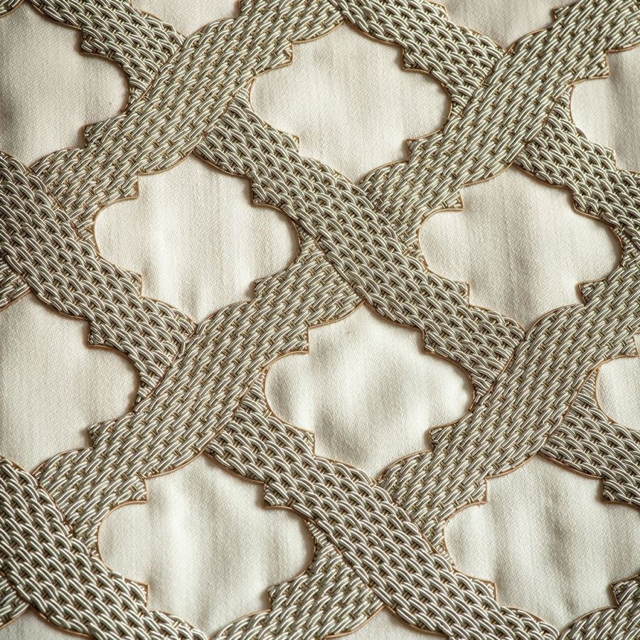 Otello is a trellis design, reminiscent of the patterns used in Moorish architecture. Its bold embroidery uses a chain mail technique in thick antiqued silver and gold threads.