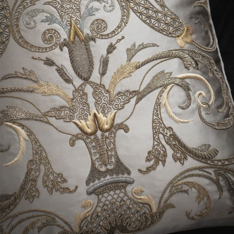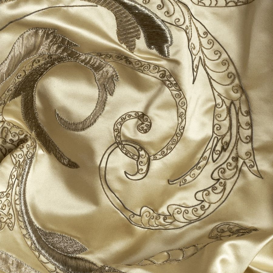The classic and gorgeously flowing large scale symmetrical design with its tumbling scrolls and curves is a celebration of an 18th century pattern with a soft subtle sheen and an irresistible luxurious texture.