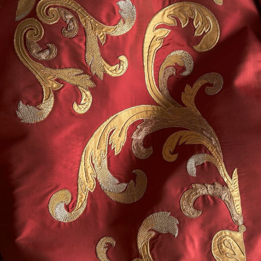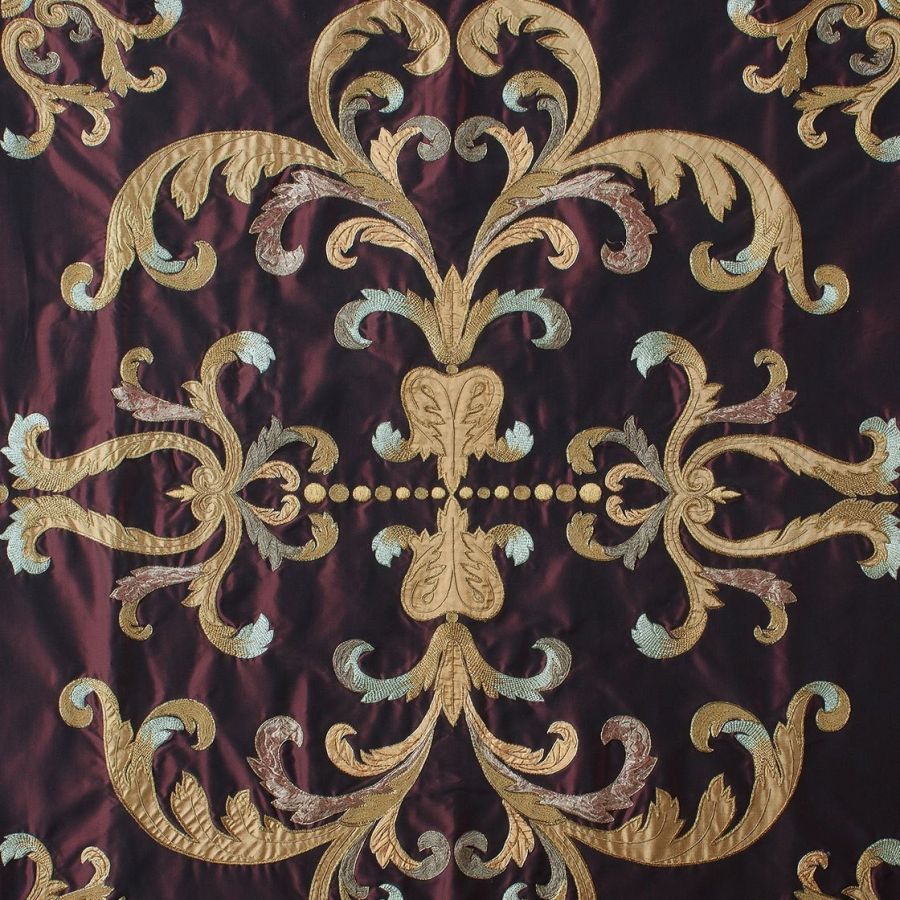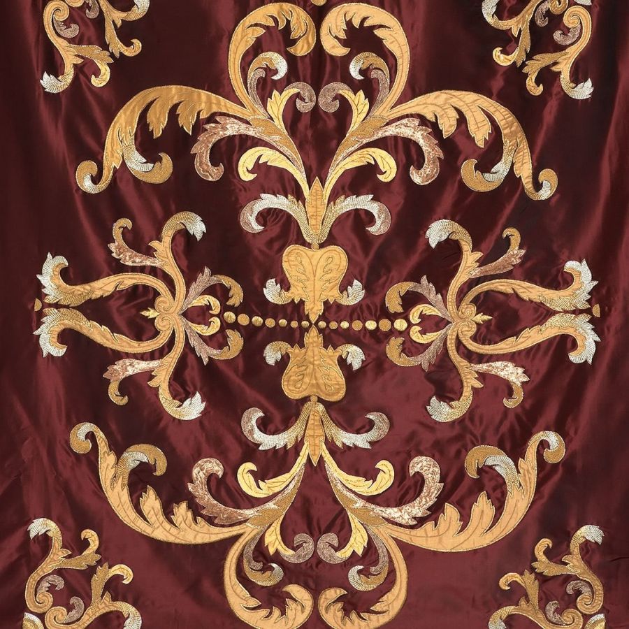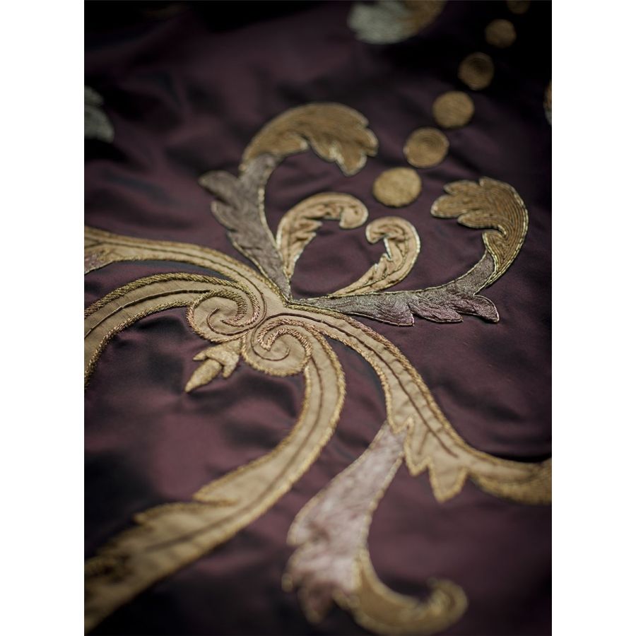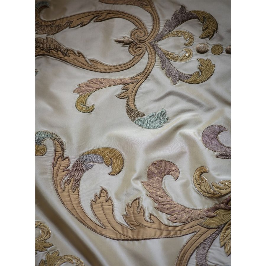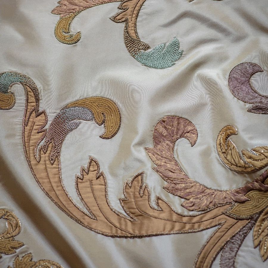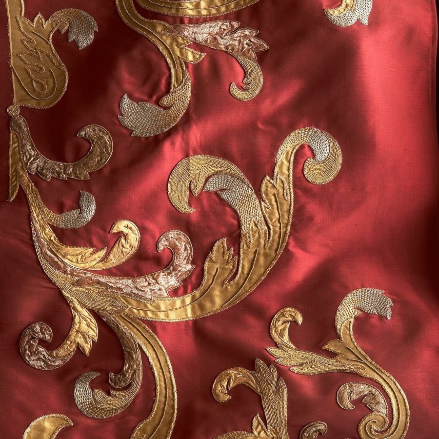 Rondine is an opulent fabric with a distinct regal quality. It comprises elegant Rococo scrolls in silk applique and antiqued gold wire.