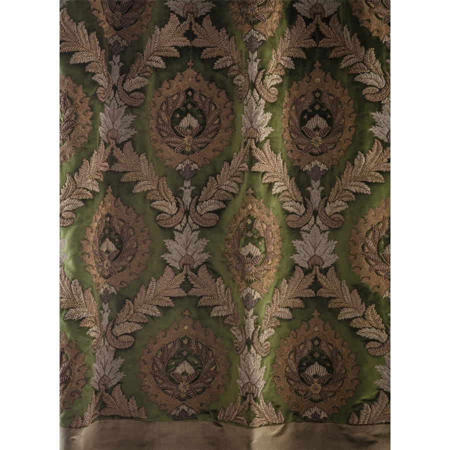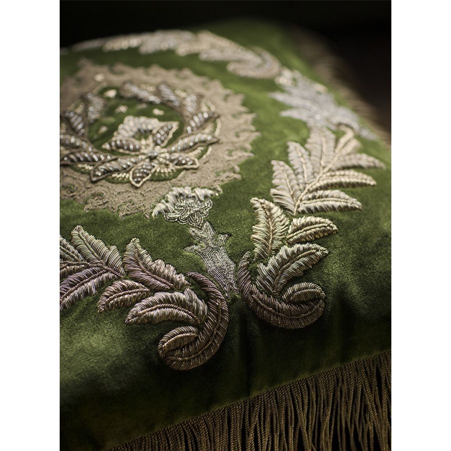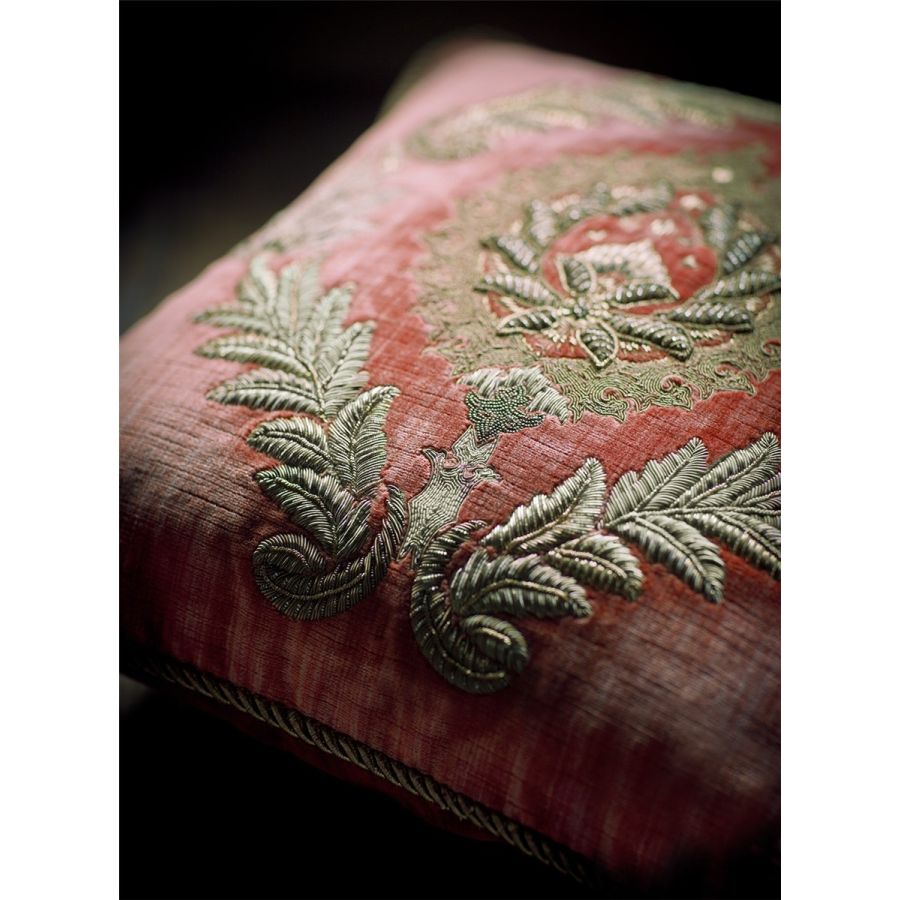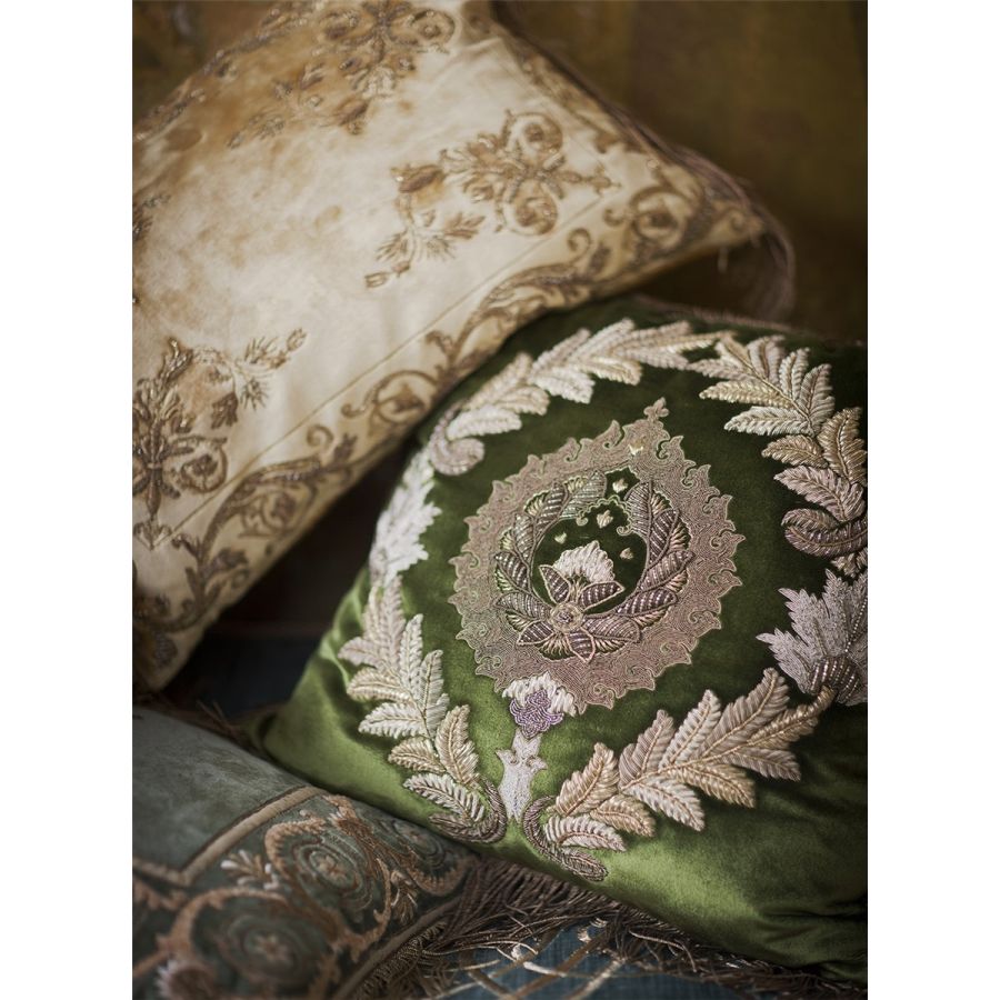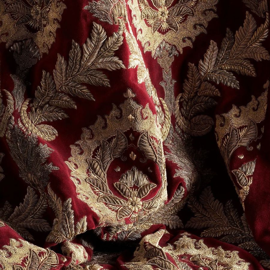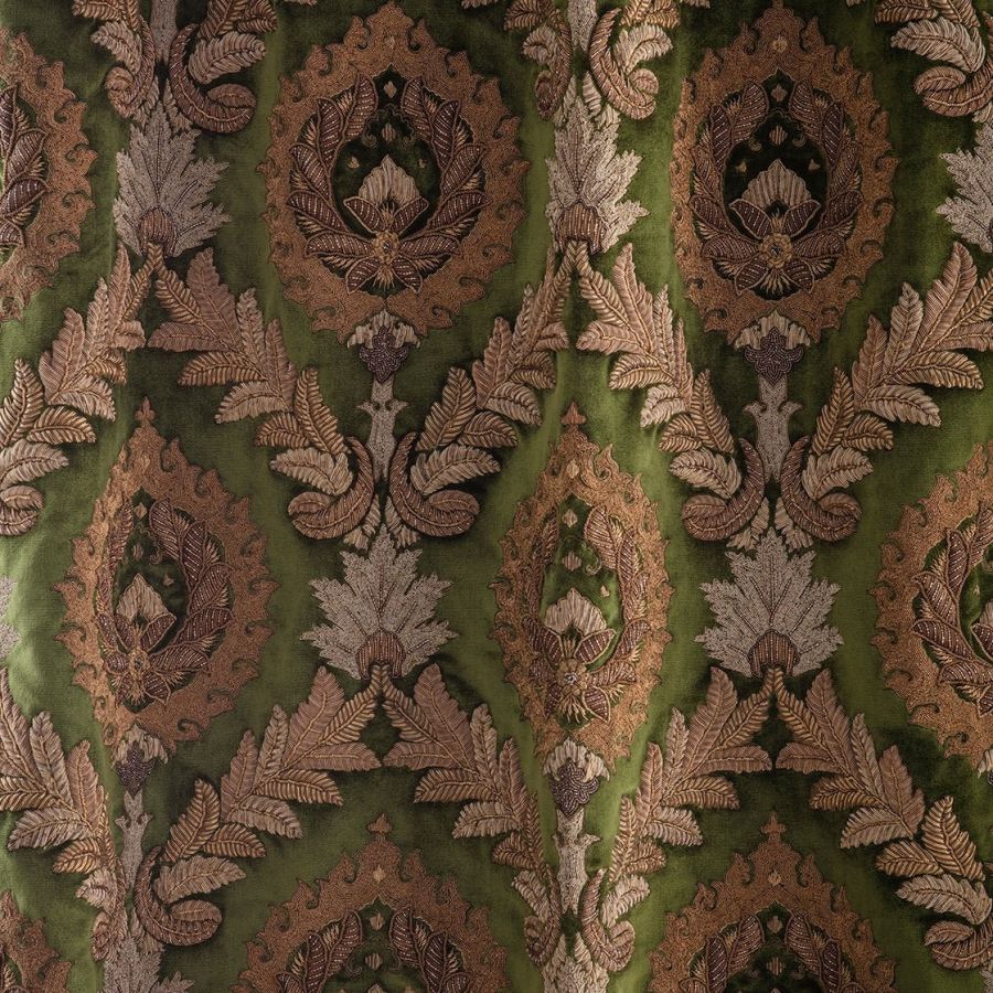Rossini features a large detailed damask pattern that oozes sumptuous opulence. Embroidered in high relief in antiqued silver and gold threads, it adds theatrical elegance to any space.