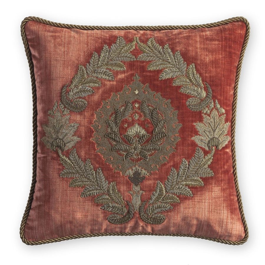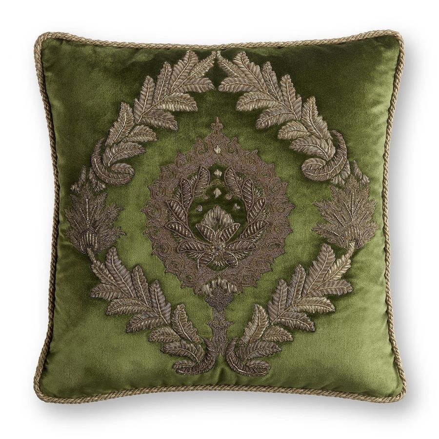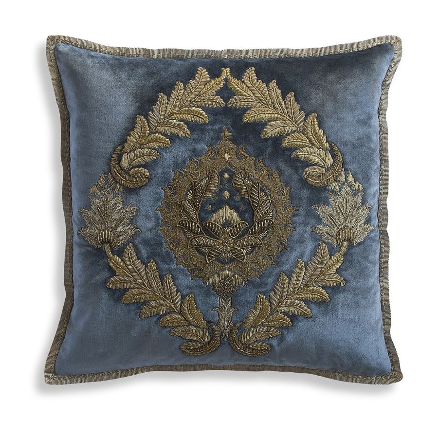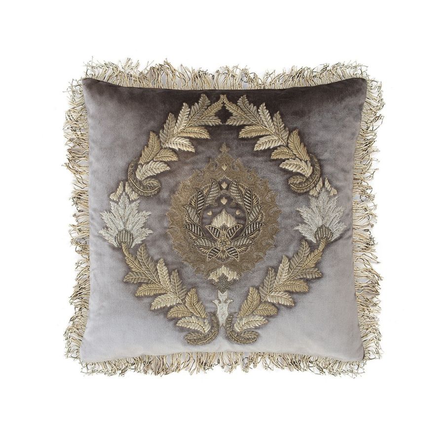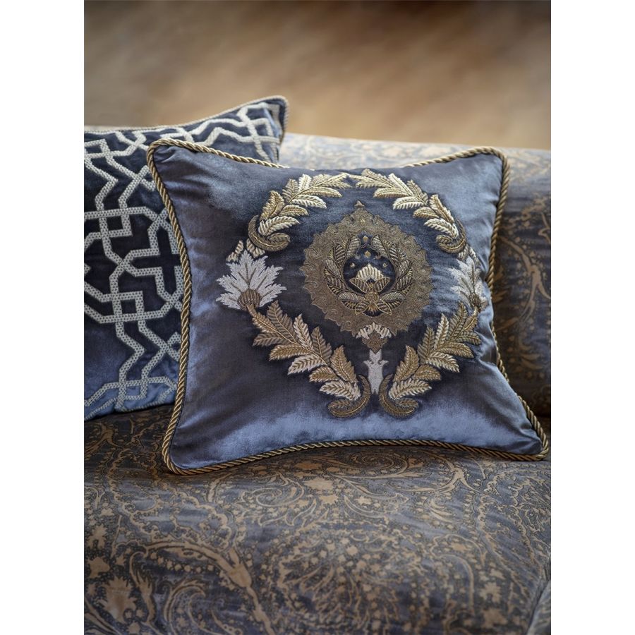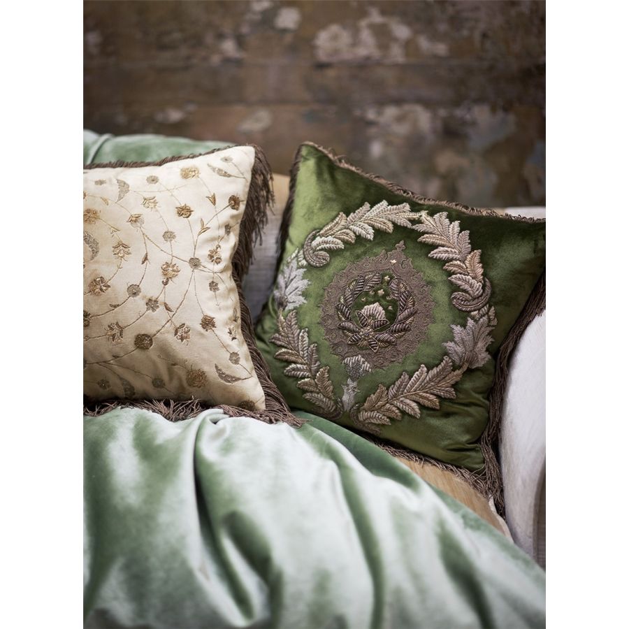 Rossini features a large detailed damask pattern that oozes sumptuous opulence. Embroidered in high relief in antiqued silver and gold threads, it adds theatrical elegance to any space.