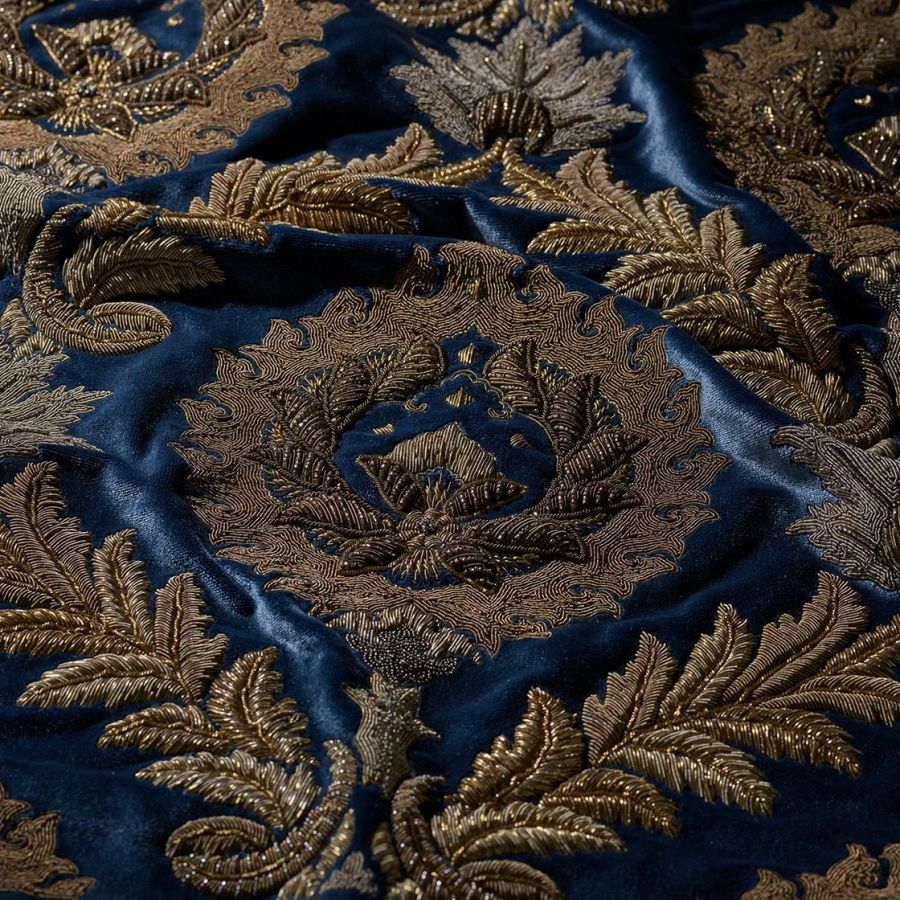 Our Couture fabrics are bespoke and hand embroidered to order. They can be created in fine gold or silver silk thread and embellished with freshwater pearls and semi-precious stones. Each pattern can be coloured and designed to fit your needs. We can embroider onto any background fabric including: silk, velvet, organza and leather.