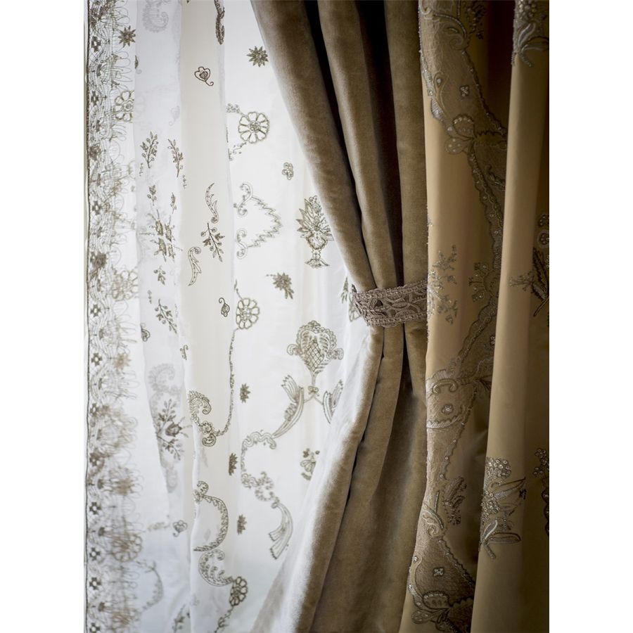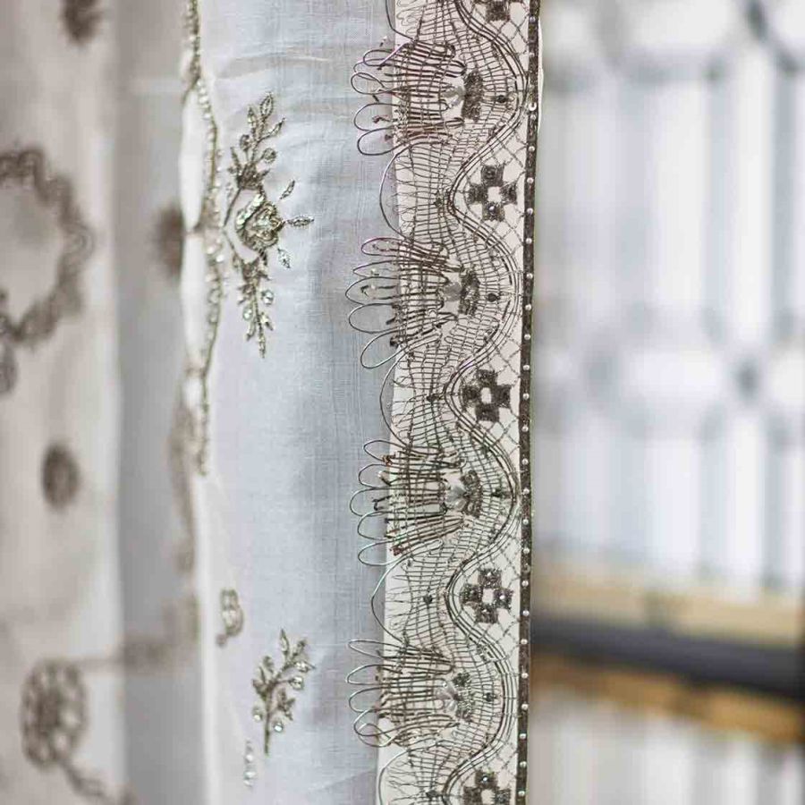 Tagore is an intricate design with a strong French 18th century influence, comprising an elegantly structured pattern of gemstones and metal embroidery.