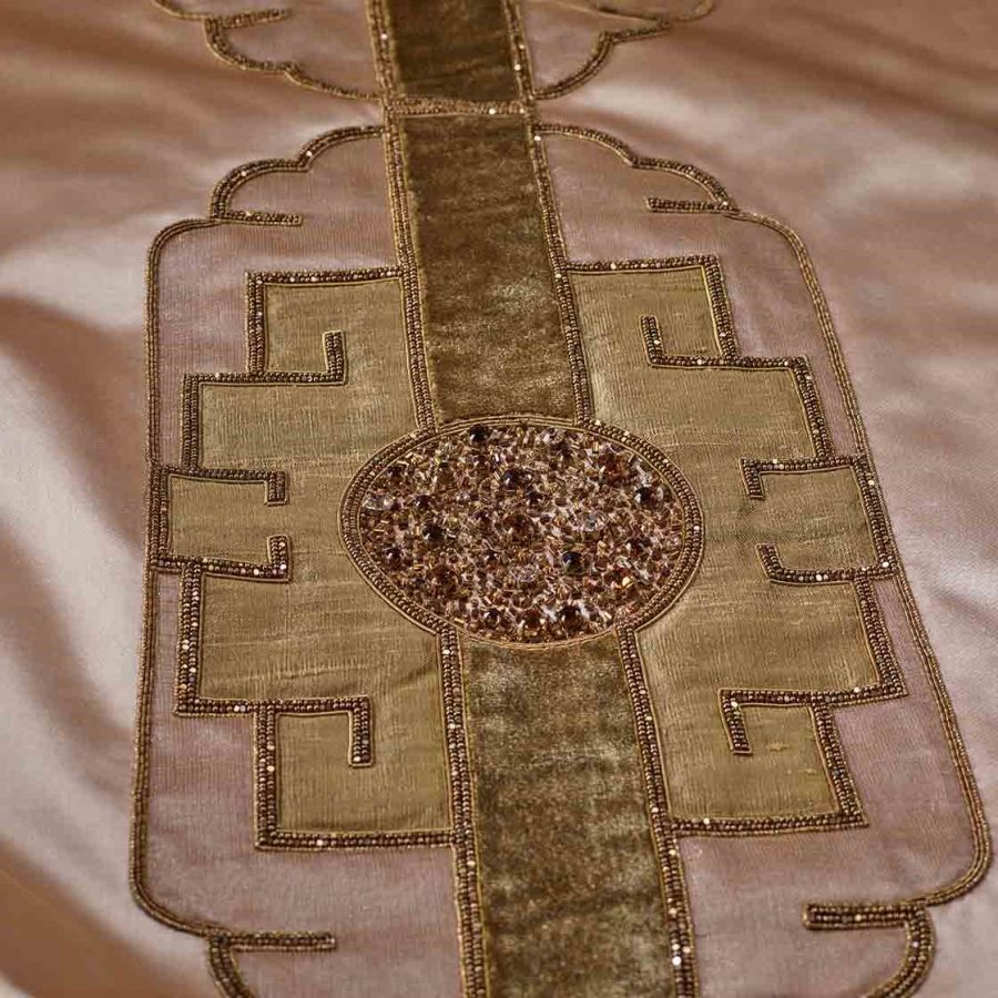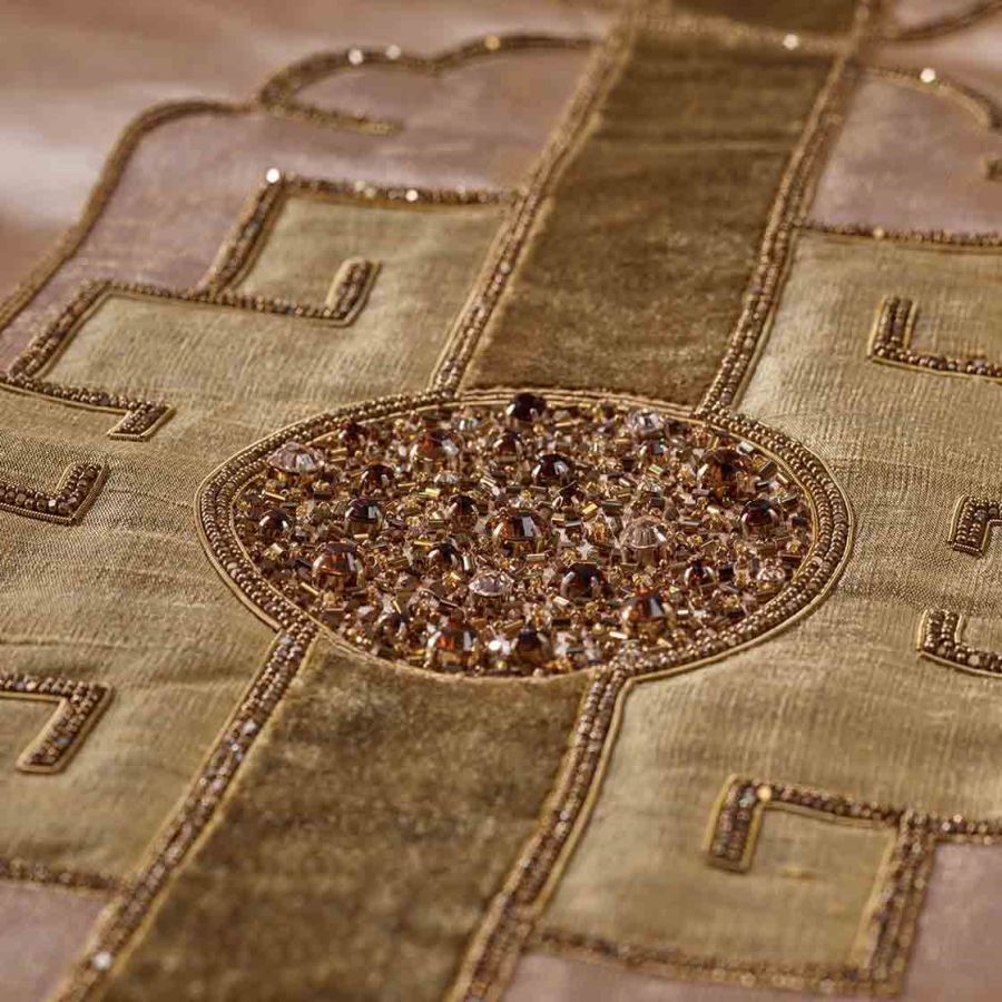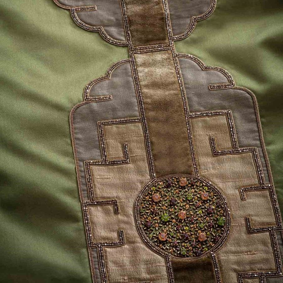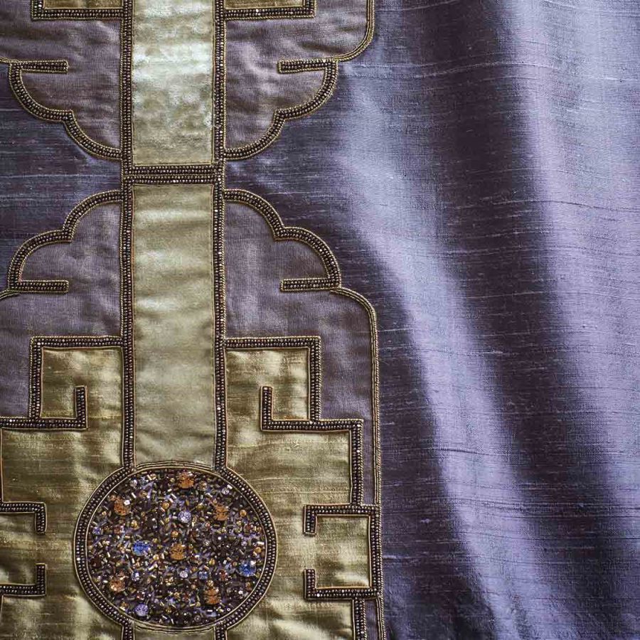 Named after the Marlow play about the Asian Emperor Timur. This is a majestic and lavish design which makes for a striking confident statement with an elegance that can only be achieved through the expression of hand embroidery.