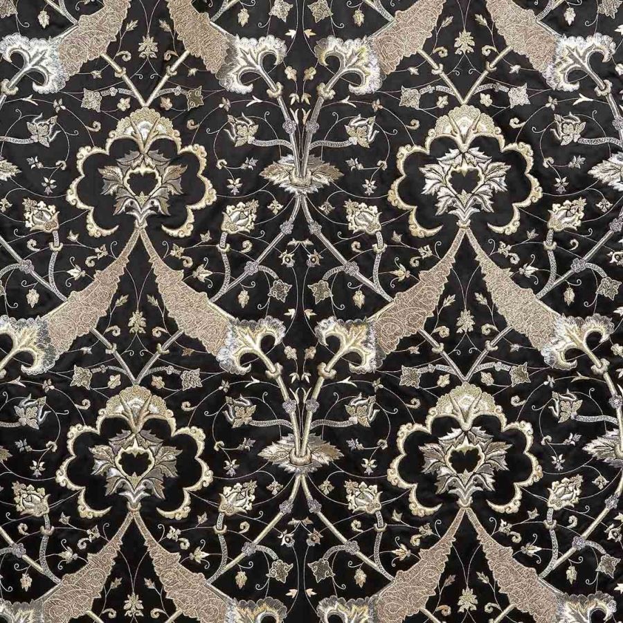 This richly detailed design is influenced by complex patterns from 17th century Ottoman tapestries. The large scale stylized motifs are highlighted using a variety of techniques and metallic threads.