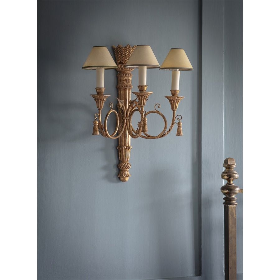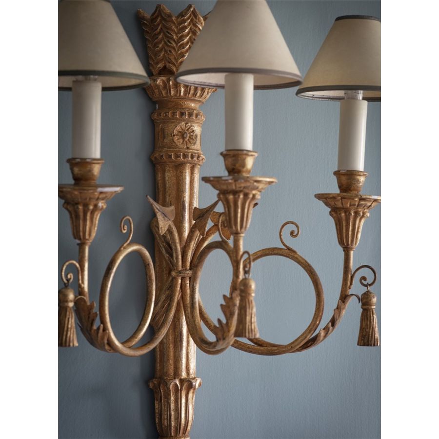 The Athena is a Regency style decorative three-branch wall light. Its body is carved as a quiver of arrows made of three scrolling branches, and it also features carved pendant tassels.
