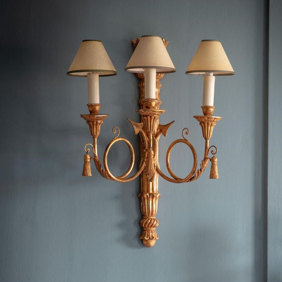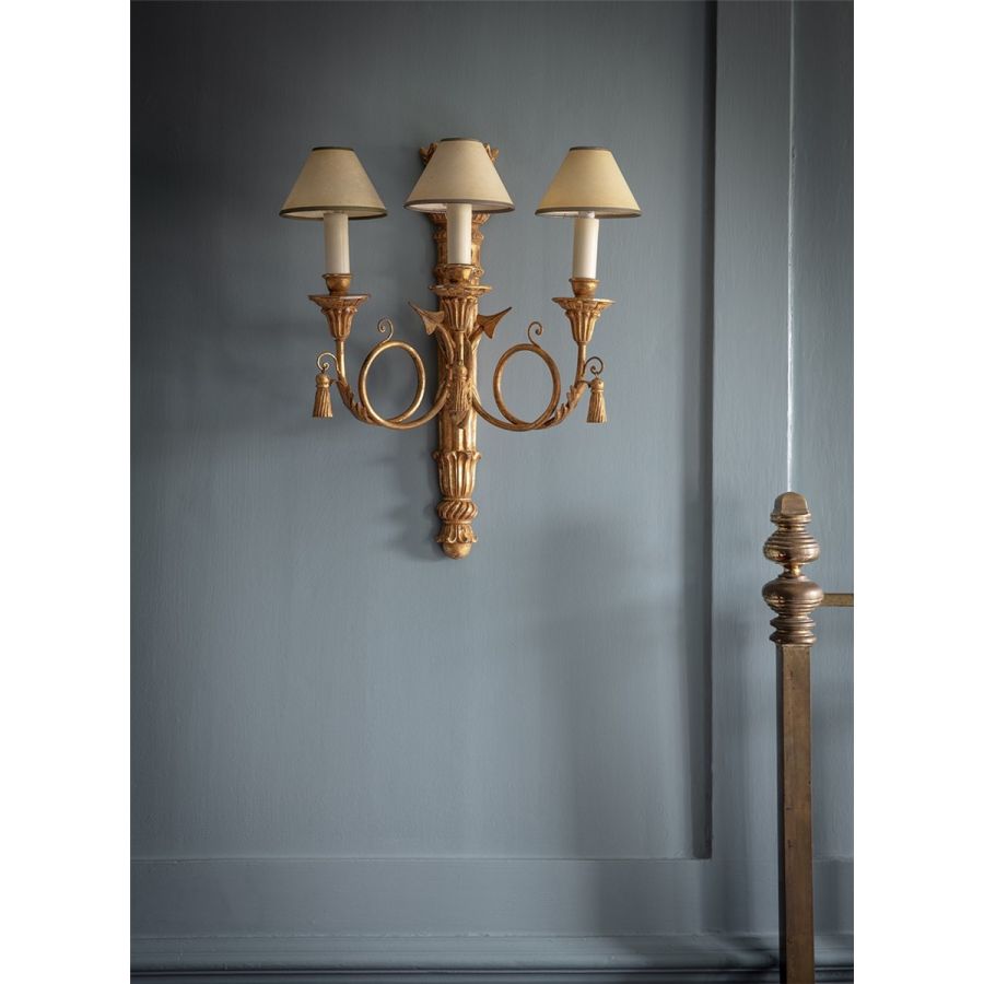A decorative 3 branch wall light in a typical Regency style. The body of the light is carved as a quiver of arrows made out of 3 scrolling branches. The whole design is decorated with classical detailing and carved pendant tassels. Our lights are made by skilled artisans. The unique range of highly decorative lights is created by hand using traditional materials, carved wood, wrought iron, and gilding with subtle patination.