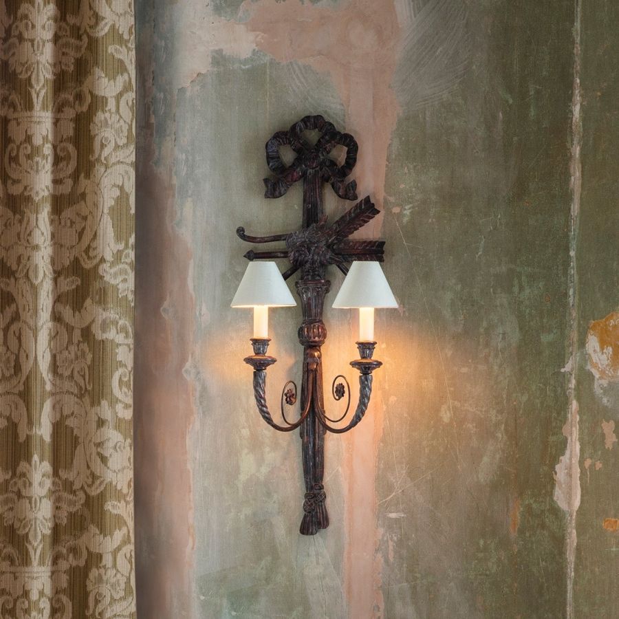 An imposing giltwood carved wall light, the Minerva features richly carved decoration including a crest made from a tasselled swag and a ribbon bow.