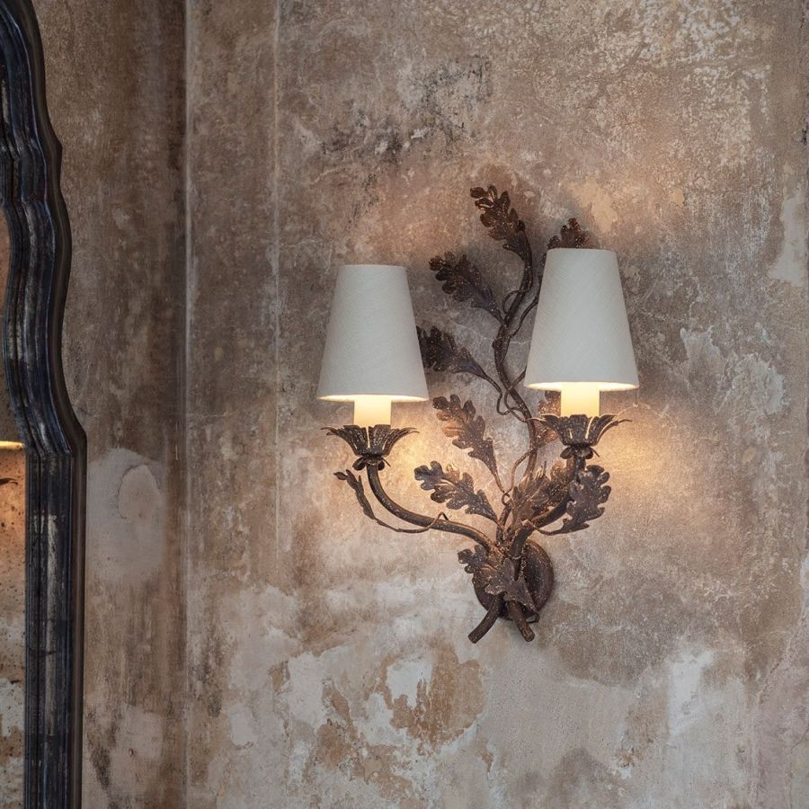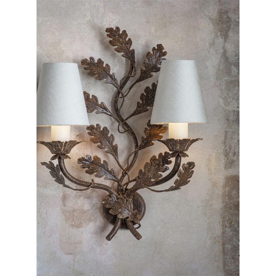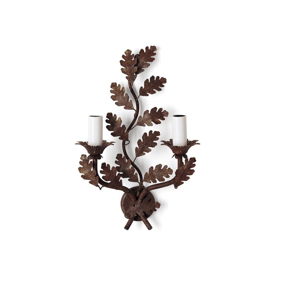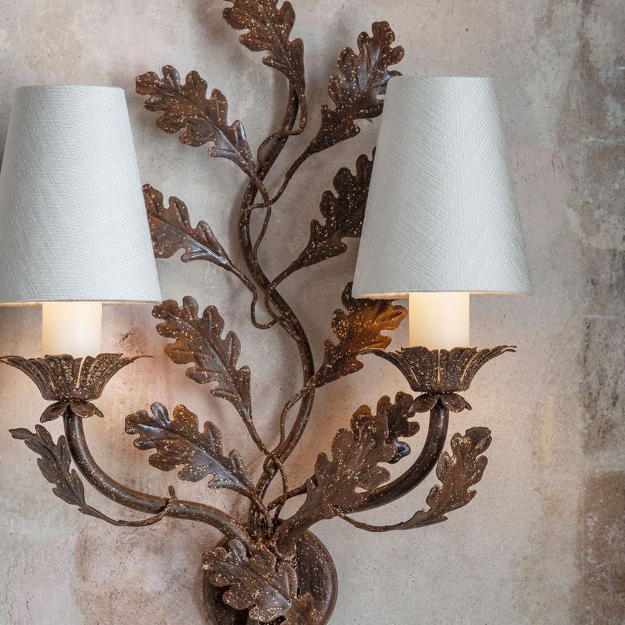 A small two-branch wall light with great charm, the Oakleaf’s scrolling central motif and arms are decorated with expertly cut metal oak leaves.