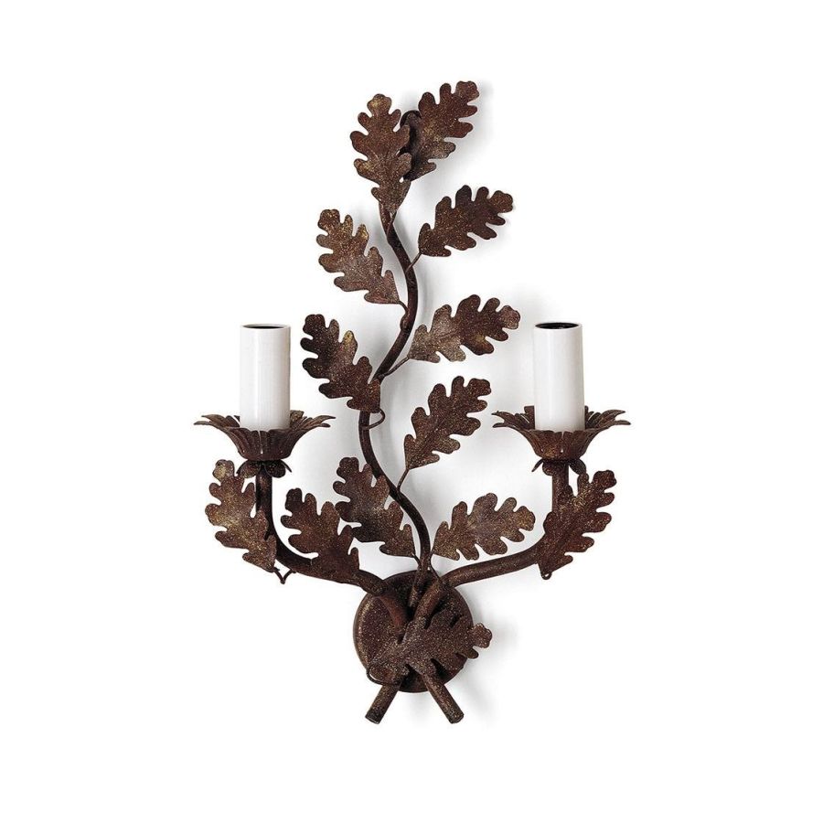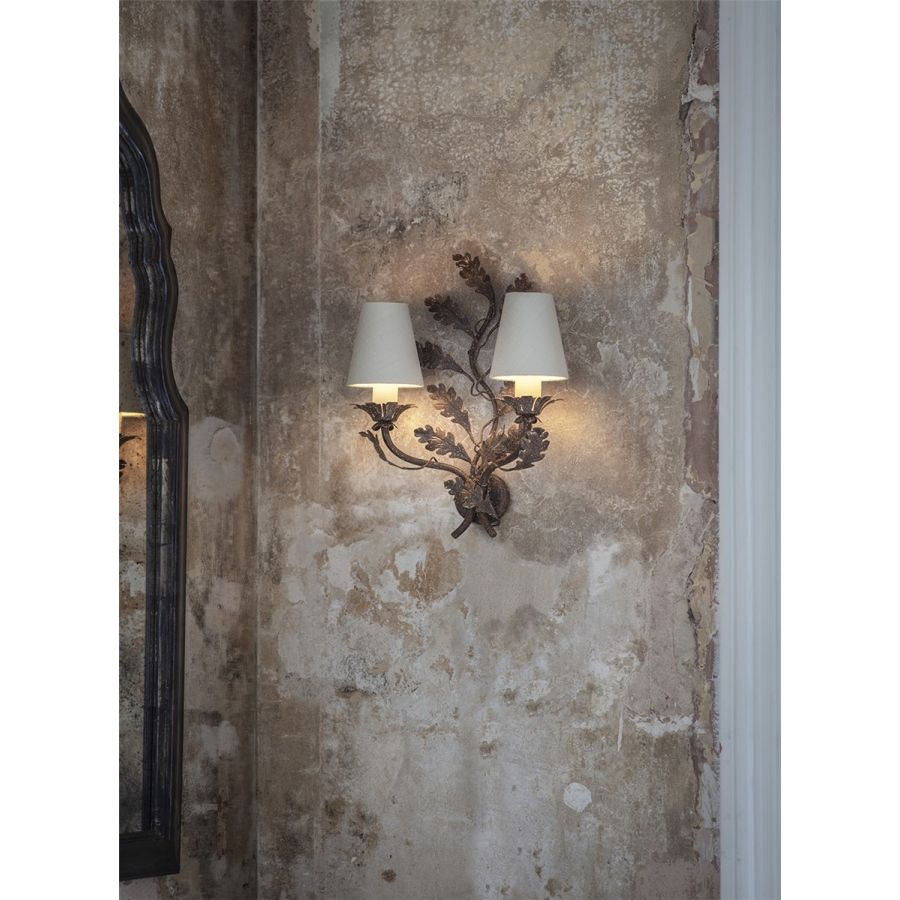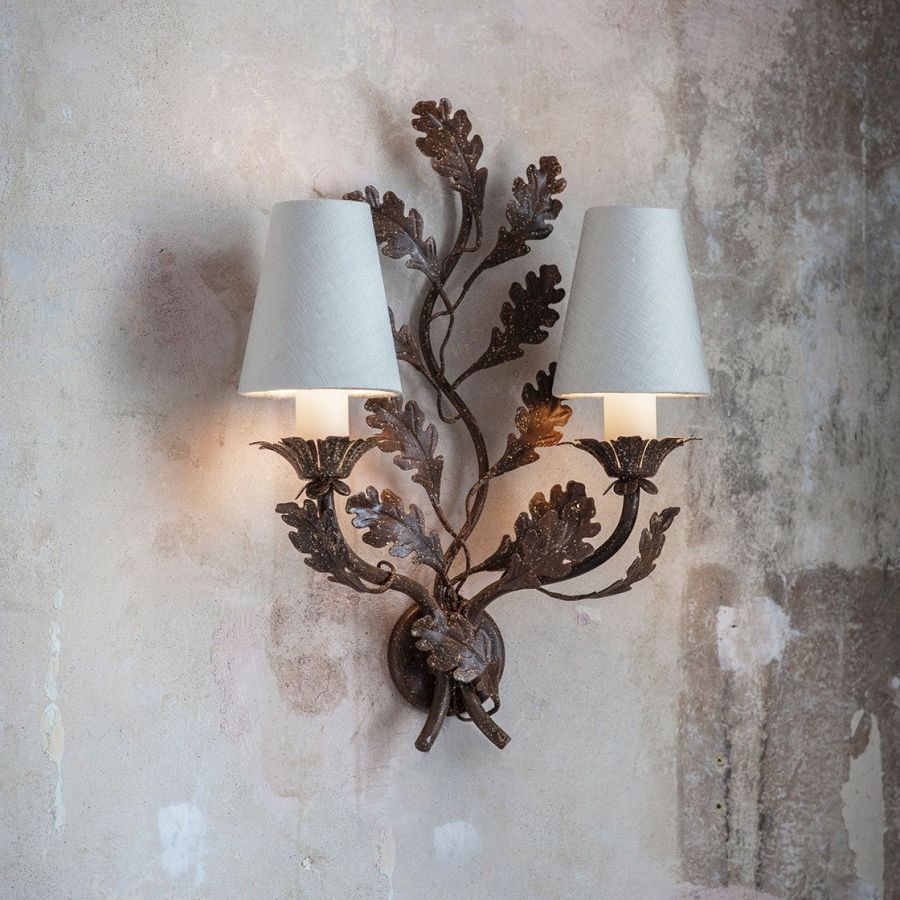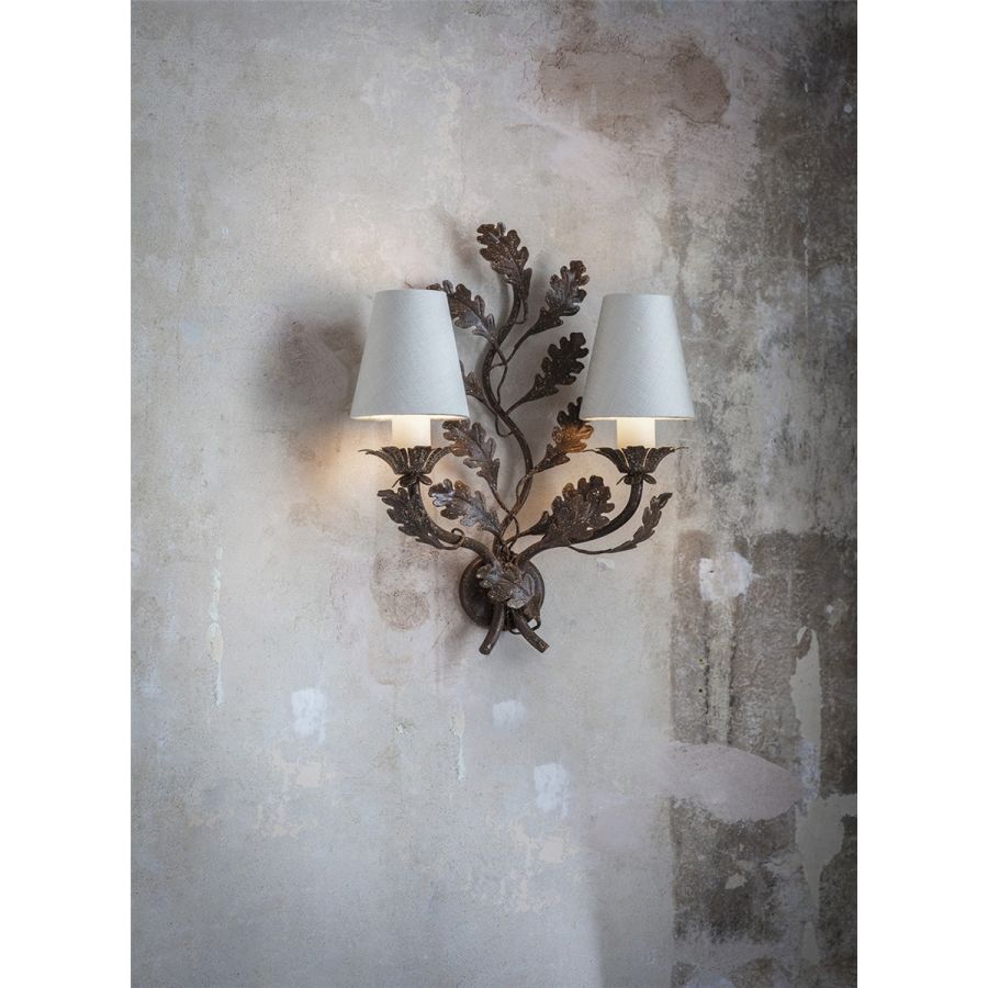 A small two-branch wall light with great charm, the Oakleaf’s scrolling central motif and arms are decorated with expertly cut metal oak leaves.