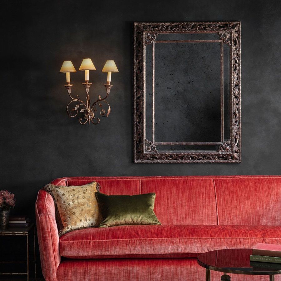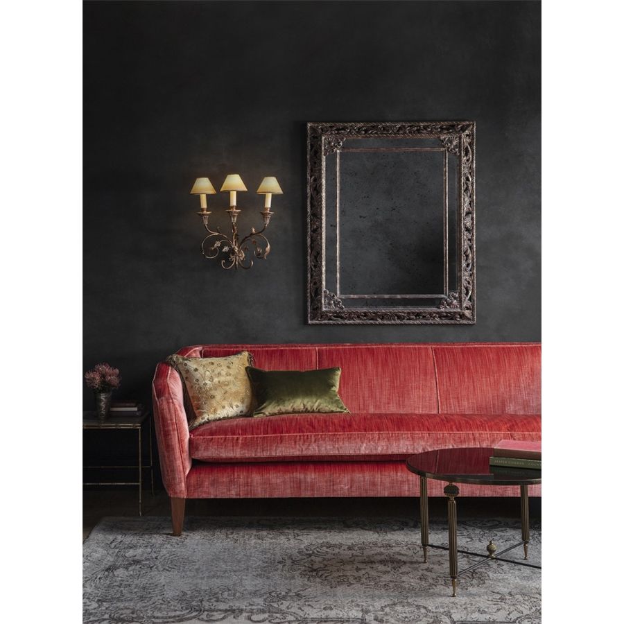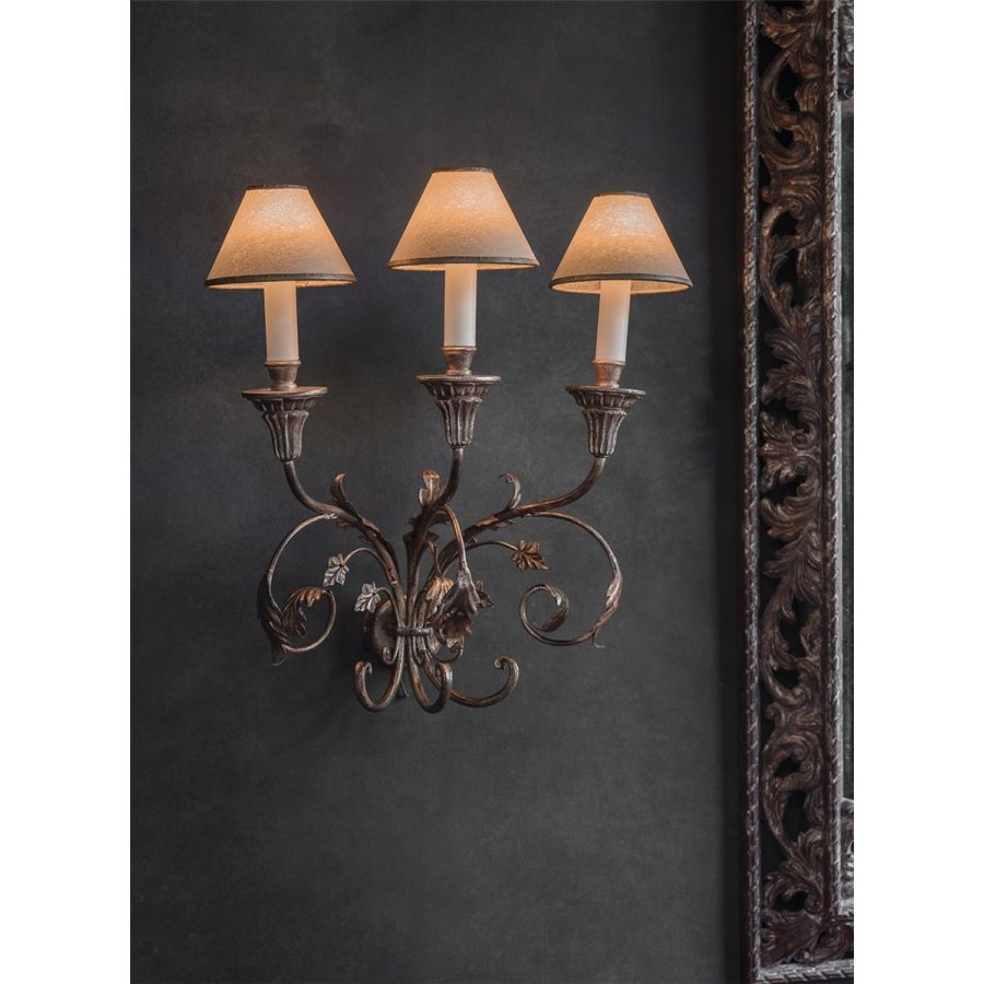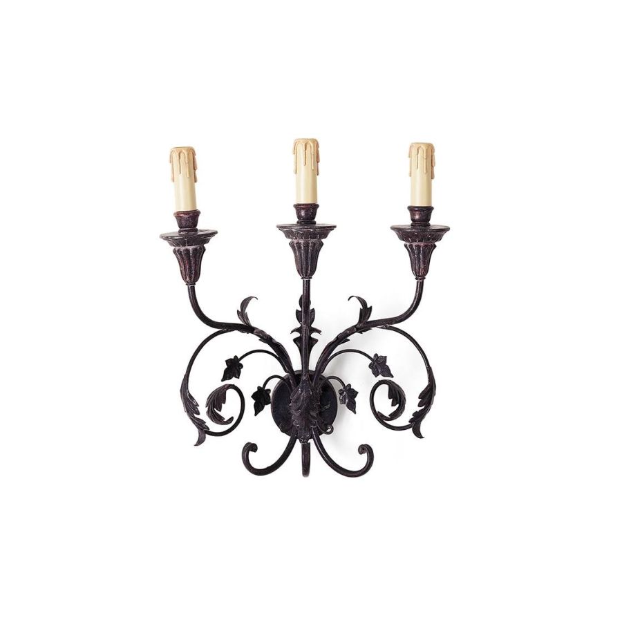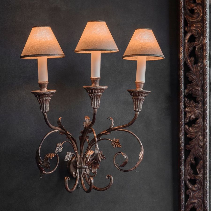 The Pisa is a tall, three-branch wall light, with a light but metallic design comprising scrolls and leaves.