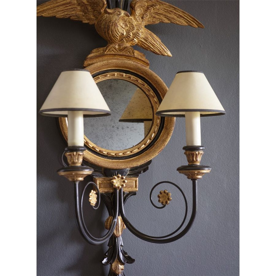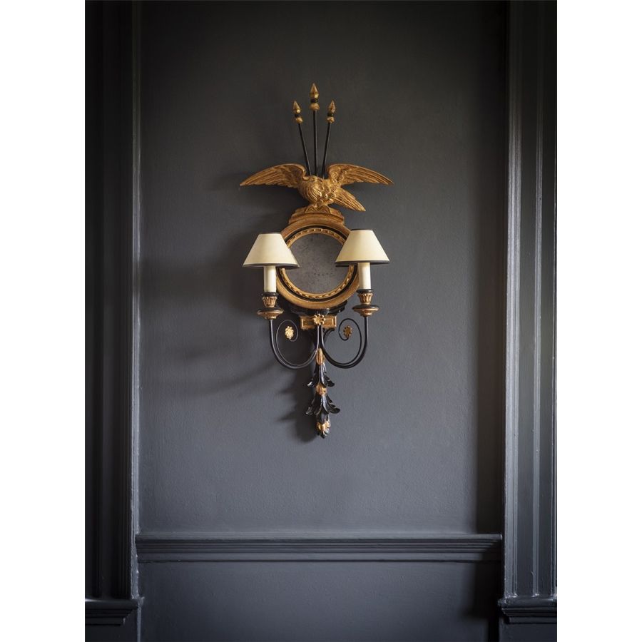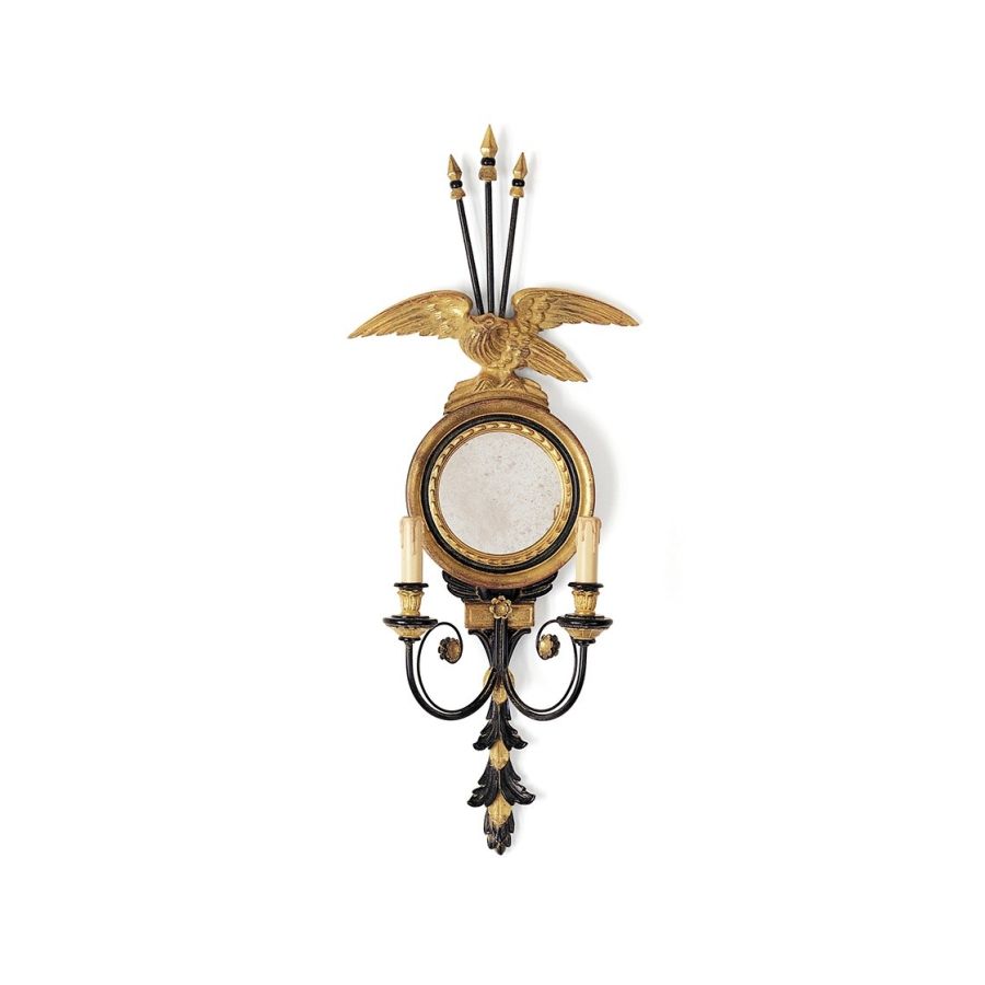 This unusual two-branch wall light, in the exuberant High Regency style, features a round, carved porthole mirror surmounted by a clutch of arrows and a triumphant eagle.