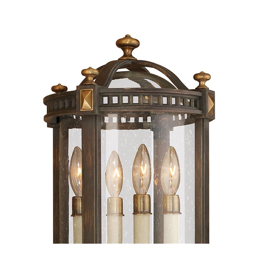 Wall mount of weathered woodland brown with gold highlights and solid brass accents. Features hand blown seedy glass.