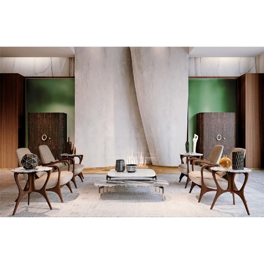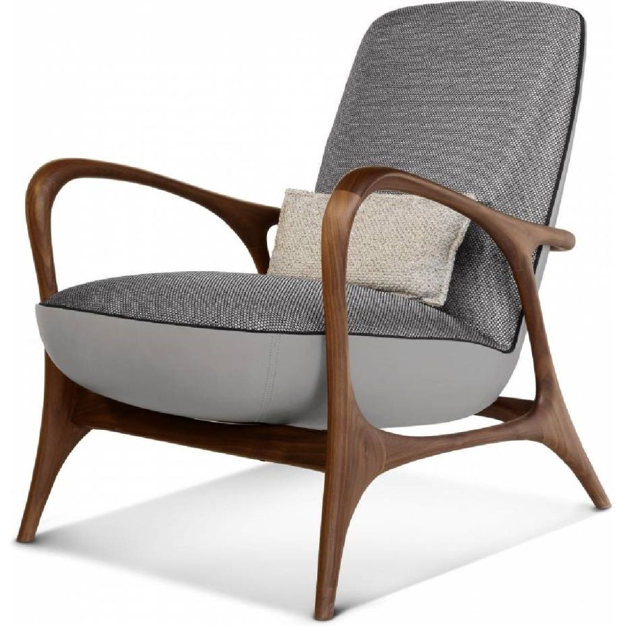 This armchair is crafted from solid Canaletto walnut with a matt finish, offering a rich and natural look that enhances its elegant design. The interior is upholstered with soft fabric, while the exterior is covered in luxurious leather, creating a stunning contrast and highlighting the beauty of the materials. The blend of solid Canaletto walnut, fabric, and leather provides a timeless appeal, making this armchair a versatile addition to both contemporary and classic interiors. Its sophisticated construction ensures comfort and durability while maintaining a refined aesthetic.