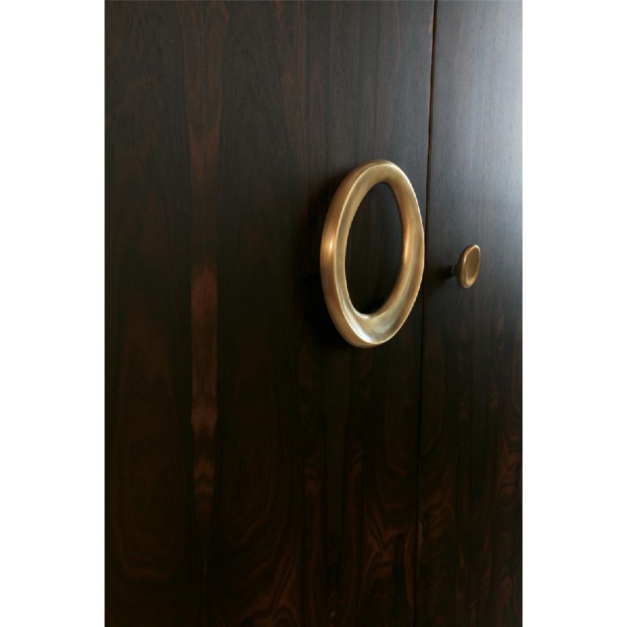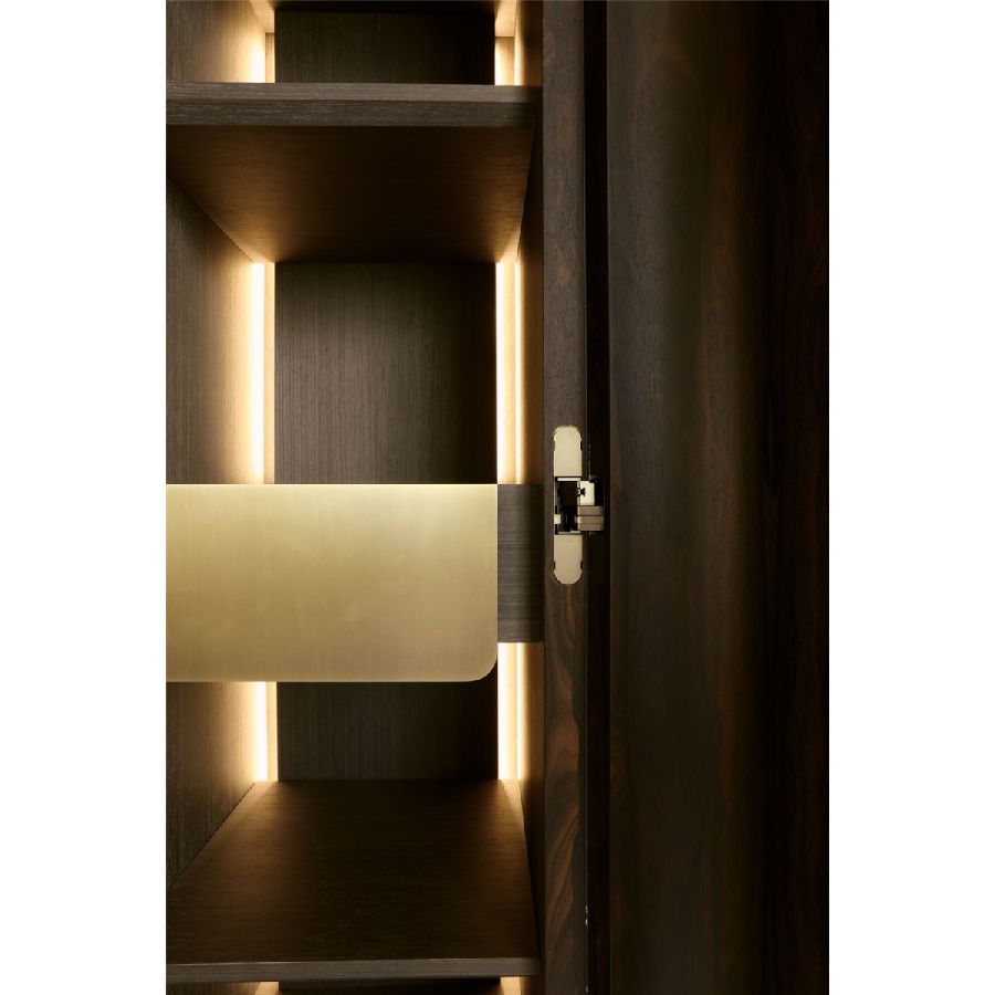 This sophisticated bar cabinet features a plywood structure veneered with Ziricote wood, finished in an elegant matte polish. Sculptural feet, handles, and internal elements in light bronzed matt brass add a refined contrast. Integrated LED lighting enhances the luxurious details, making it a functional yet stylish addition to any space. Designed by Ezio Bellotti, this piece reflects a perfect balance of craftsmanship and contemporary elegance.