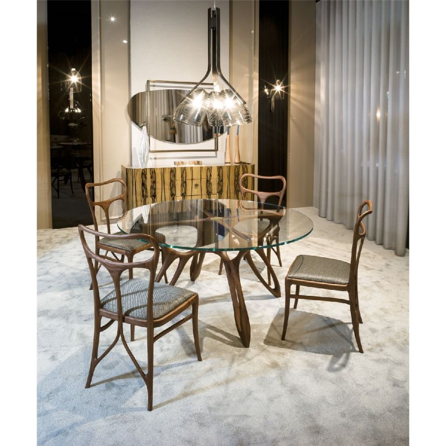 This chair showcases the timeless elegance of solid Canaletto Walnut with a sophisticated matt finish. The natural wood grain enhances its refined aesthetic, while the fabric upholstery provides a touch of softness and comfort.