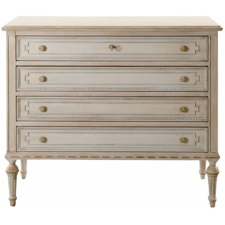 A timeless expression of elegance, this classic chest of drawers blends refined craftsmanship with a luxurious finish. The exquisite LAFM lacquered brushed French tempera in White Meringue, complemented by a Base Gold Leaf accent, enhances its sophisticated appeal. The wooden top adds a touch of natural warmth, making it a perfect addition to elegant interiors.