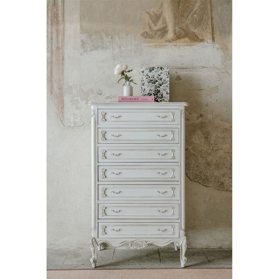 A perfect blend of simplicity and elegance, this 7-drawer chest features a linear and essential design that embodies refined craftsmanship. The LAFM lacquered brushed French tempera in White Meringue, enriched with a Base Gold Leaf finish, enhances its sophisticated aesthetic while maintaining a timeless charm.