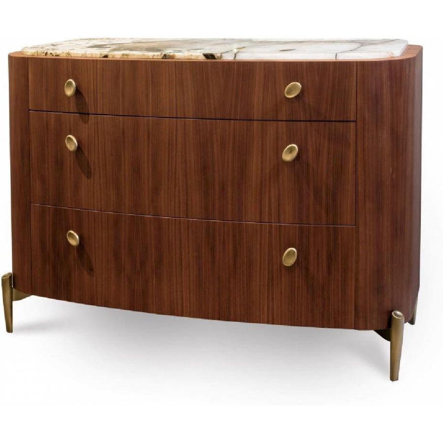 This chest of drawers features a Canaletto Walnut veneered structure with a matt finish, providing a sophisticated yet warm touch. Sculptural feet and knobs in light bronzed matt brass enhance the overall design, while the luxurious Patagonia marble top adds a touch of elegance. Designer: Ezio Bellotti.