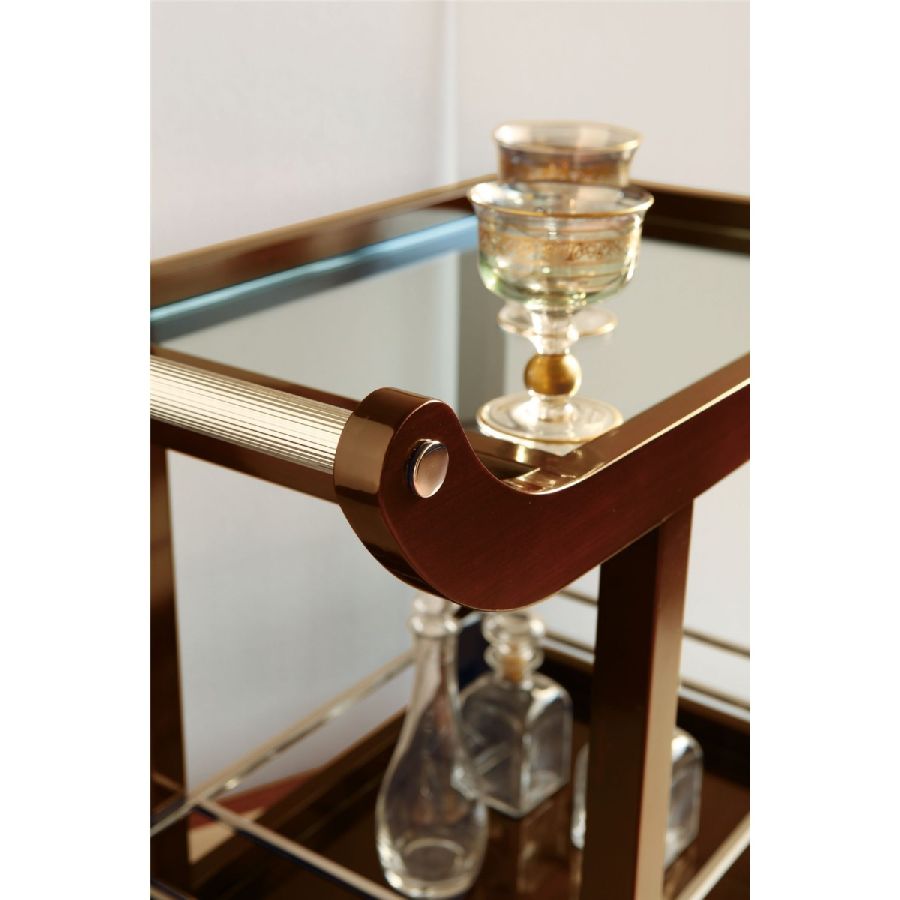 This trolley table is an elegant and functional piece that seamlessly blends traditional craftsmanship with modern style. The solid Canaletto walnut wood provides a warm, rich foundation, while the glass top adds a touch of lightness and sophistication. The bright brass elements provide a gleaming contrast, elevating the overall design with their polished shine. Ideal for serving or as a decorative accent, this trolley table brings both utility and luxury to any space.