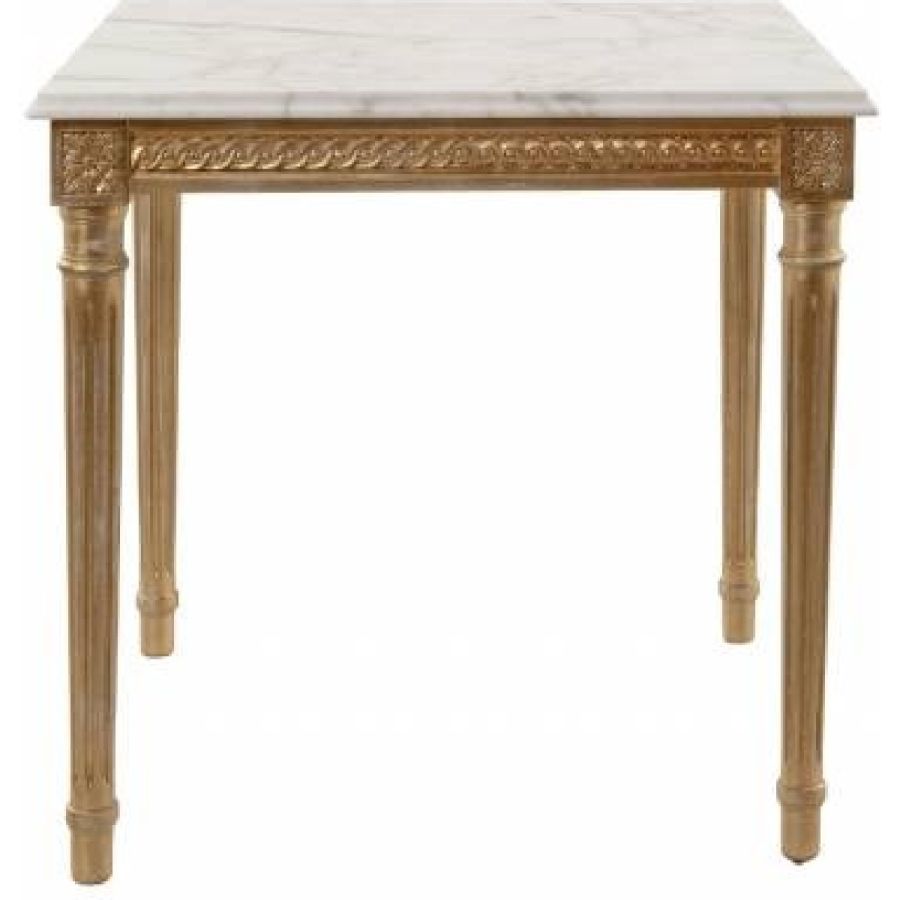 This Louis XVI-style side table embodies timeless elegance with its luxurious Calacatta Gold marble top and finely carved wooden base. The OR5 brushed gold leaf finish, complemented by a white meringue base, enhances its regal charm, making it a sophisticated accent piece for any interior. Designed with exquisite craftsmanship, this side table blends classical refinement with artistic detailing, ideal for both traditional and contemporary settings.