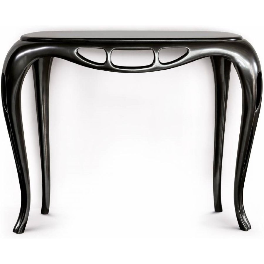 This console is a perfect fusion of sleek, modern design and luxurious materials. The structure, crafted from Lime wood, is lacquered in black nickel, giving it a sophisticated, contemporary finish. The Total Black marble top adds a dramatic touch, with its deep, rich tones and striking surface, making this piece an ideal addition to any refined interior. The combination of the sleek black lacquer and dark marble creates a bold, elegant statement, perfect for modern living spaces.