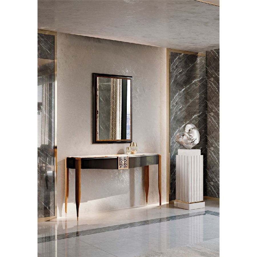 This Console, with a single drawer, showcases a perfect balance of elegance and functionality. Crafted from fine canaletto walnut and glossy black lacquered parts with intricate polychrome inlays, the design is enriched by a stunning onyx tramonto top that radiates warmth and sophistication. Its refined detailing brings timeless style to any space.