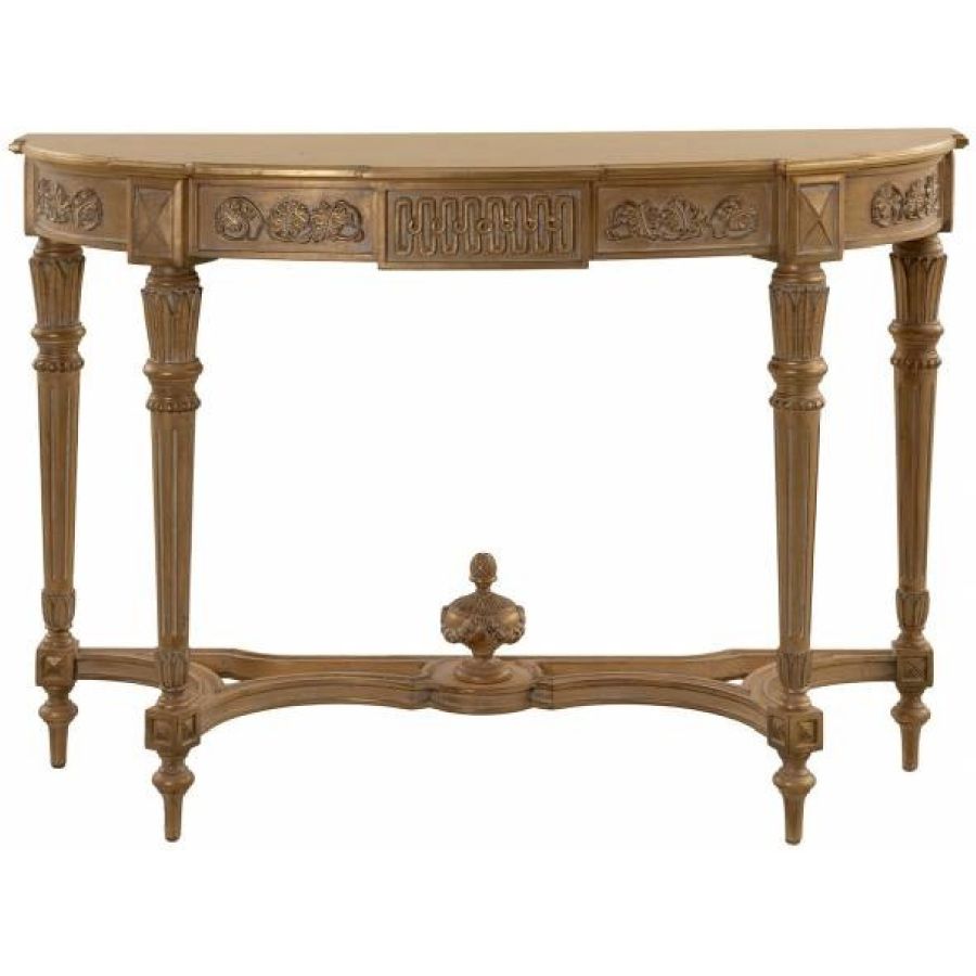 This console features a sophisticated OCH gold leaf patinated white meringue (Oro Chic) finish, showcasing a blend of classic elegance and modern refinement. The carved wooden base and wooden top are beautifully finished, adding a touch of luxury and timeless charm to any space. Its delicate proportions and elegant design make it the perfect statement piece for an entryway or living area, effortlessly enhancing the ambiance.