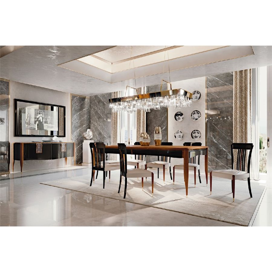 This elegant dining table seamlessly blends the warmth of canaletto walnut with the striking contrast of glossy black lacquered elements. The refined design is completed with bright brass end-feet, adding a touch of sophistication and timeless appeal. With a length of 220 cm, this table offers ample space for gatherings while maintaining a sleek and modern aesthetic. Designed by Ezio Bellotti, it reflects a deep appreciation for exquisite materials and expert craftsmanship, making it a standout piece in any dining setting.