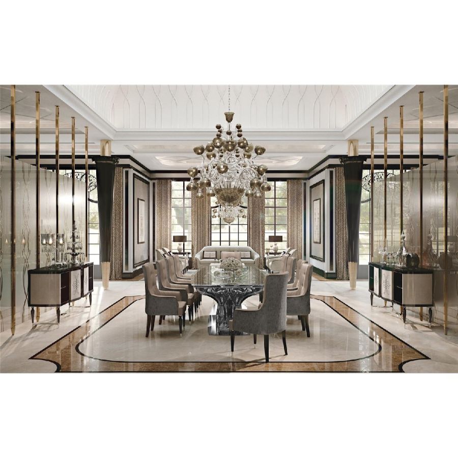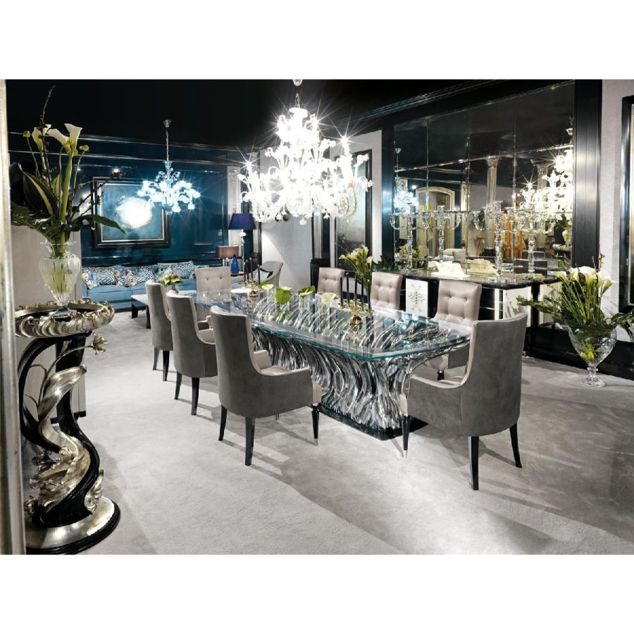 This magnificent carved solid wooden table showcases intricate craftsmanship and elegant design. With a polished chrome base that reflects sophistication, the table's crystal top adds a touch of luxury and clarity. Measuring 3.5 meters in length, this table is ideal for larger spaces, making it a perfect focal point for grand dining rooms or offices. The clean lines and refined materials exemplify Ezio Bellotti's commitment to blending artistic form with functional beauty.