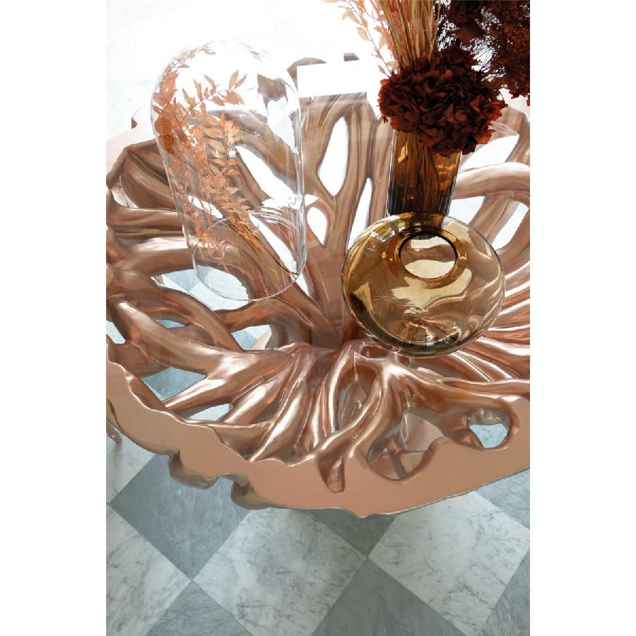 The Ficus table/sculpture brings a fresh and artistic interpretation to classic design with its Sakura pink finish, reminiscent of the delicate beauty of Japanese cherry blossoms. The carved round table, crafted from solid lime wood, features a lacquered Sakura color with a matte metal effect that enhances its unique character. The transparent crystal top completes the table, adding an elegant touch to the overall design.
