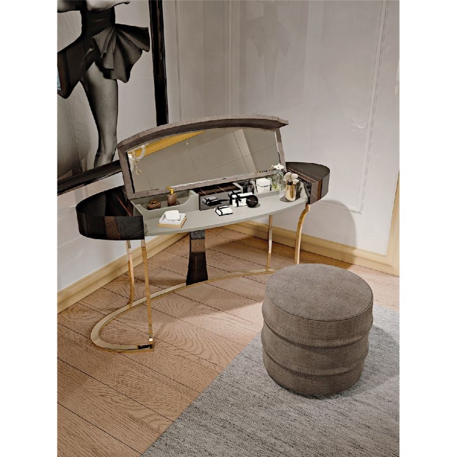 This elegant dressing table is crafted from fine ebony wood, with a luxurious openable top cover in leather. Inside, the structure features grey-finished maple wood, enhancing its sophisticated look. The base is made from bright brass, providing a striking contrast and adding a touch of modernity to the classic design. Designed by Ezio Bellotti, this piece is a perfect fusion of practicality and beauty, bringing both functionality and luxury to your space.