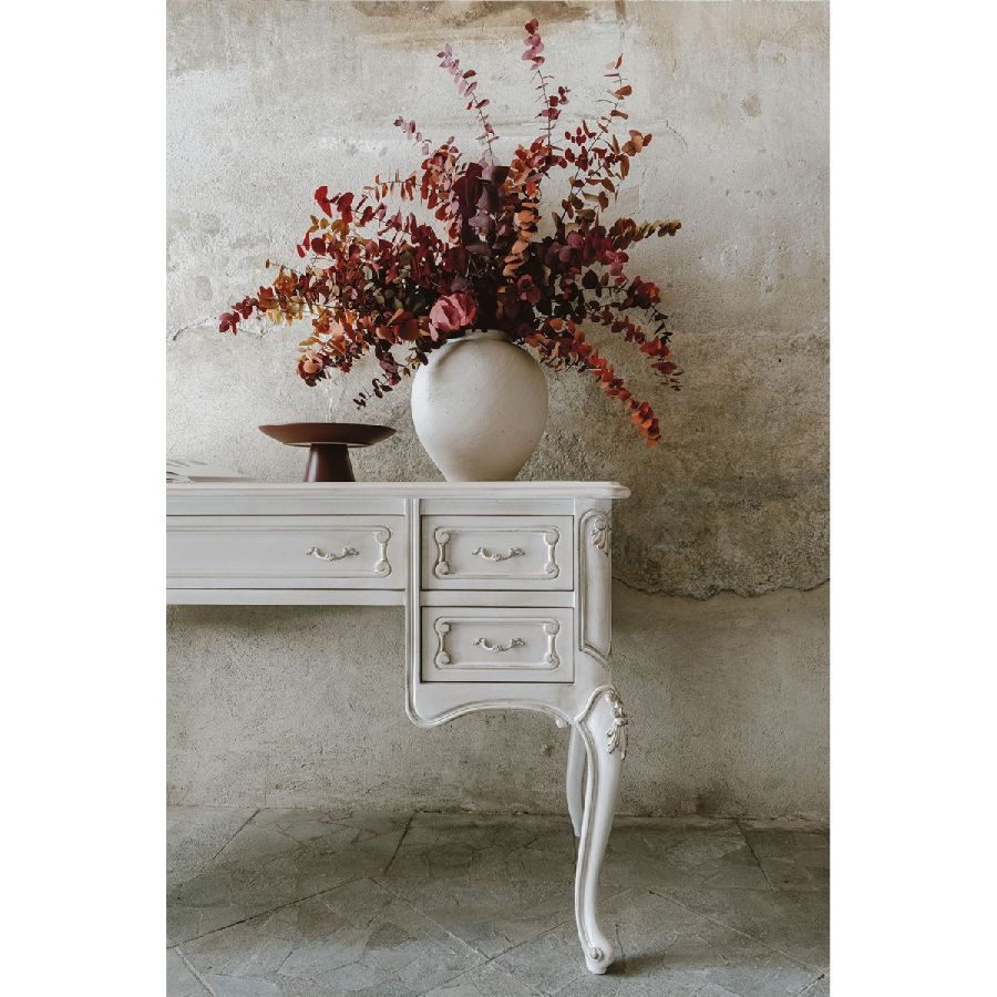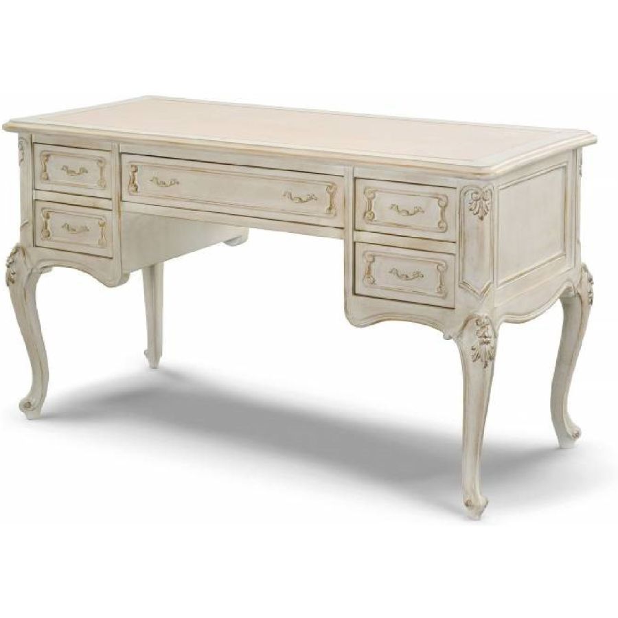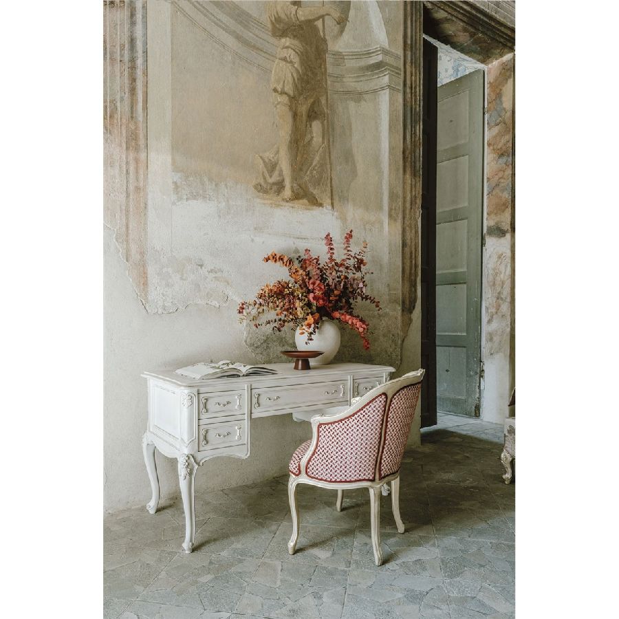 This refined desk features a leather insert and is crafted with a finish of LAFM lacquered brushed French tempera in white meringue, complemented by a gold leaf base. The desk, with its wooden top and leather insert, embodies sophistication and elegance, making it an ideal addition to any office or study space. Designed by the Bellotti Ezio Team, it combines luxury with functionality for a truly exquisite piece.