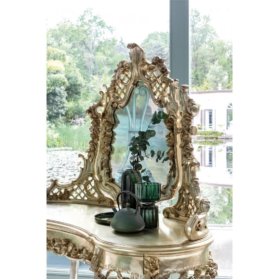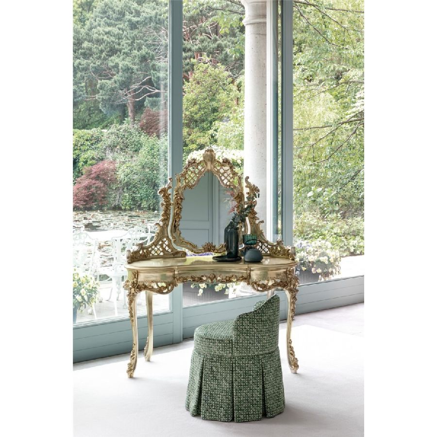 This dressing table with an incorporated mirror is a unique piece that brings character and elegance to any room, thanks to its intricate inlay work. Crafted from carved wood and finished with Silver Gold leaf, it combines timeless beauty with sophisticated craftsmanship. Designed by the Bellotti Ezio Team, this piece is both a functional and decorative statement, elevating the aesthetic of your space.